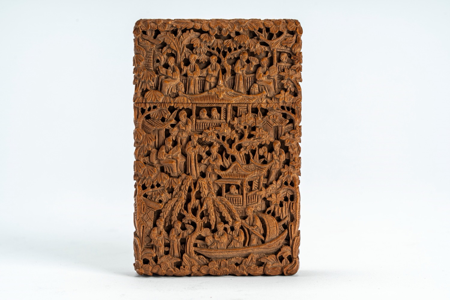 Porta biglietti in legno finemente intagliato con figure in un giardino di palazzo. Cina, Canton, secolo XIX