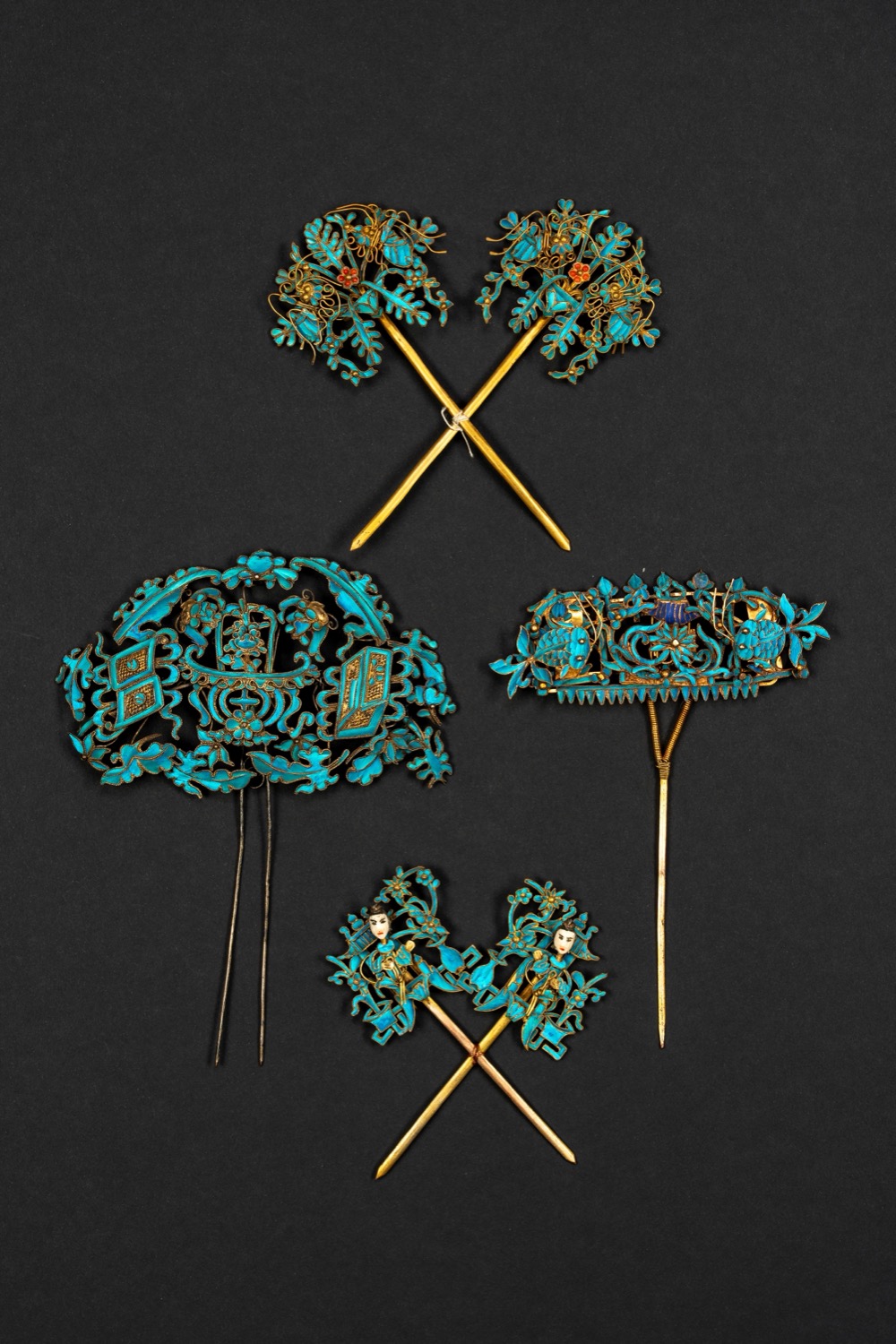 点翠发簪,单针带弹簧,蓝色和深蓝色翠鸟羽毛装饰,中国,十九世纪traforato con creature acquatiche, motivi architettonici e fiori.