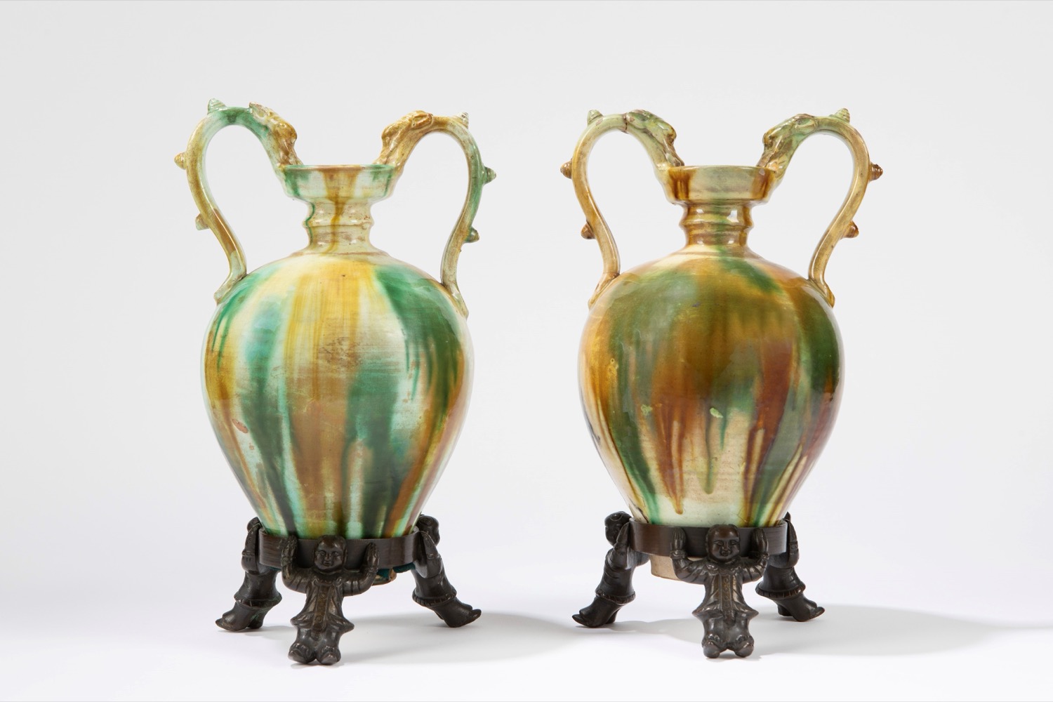 三彩釉面花瓶一对,铜底座