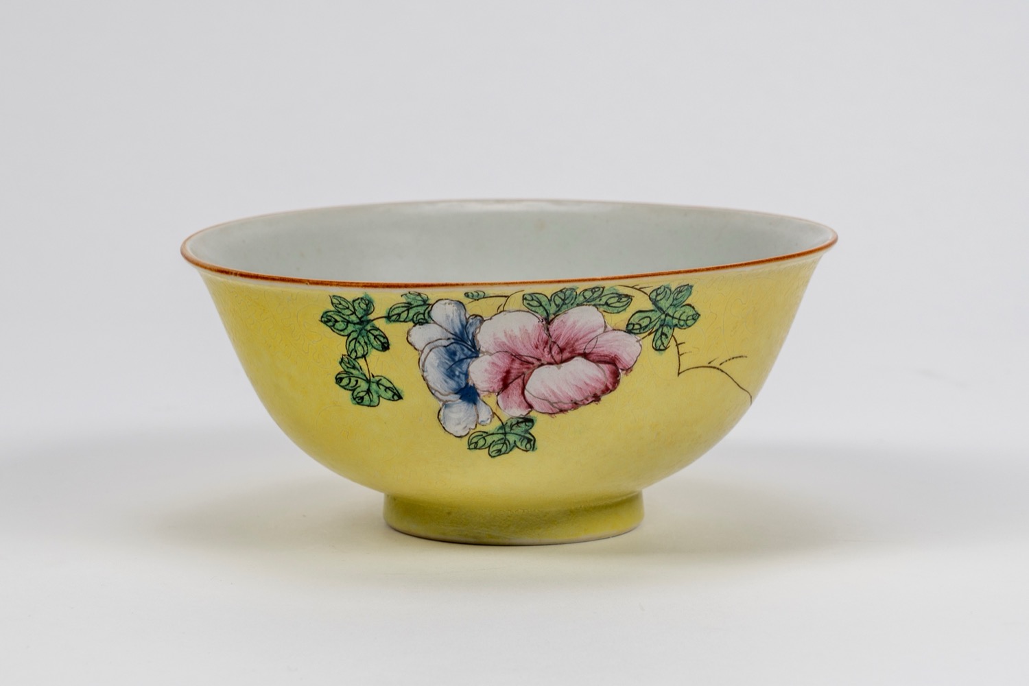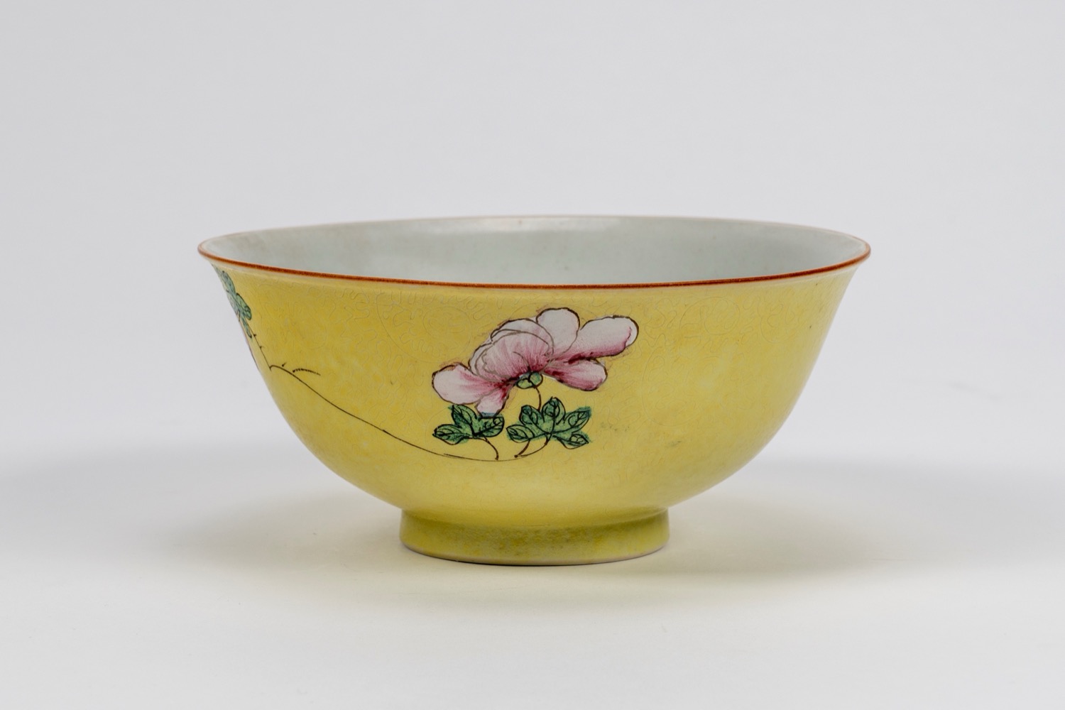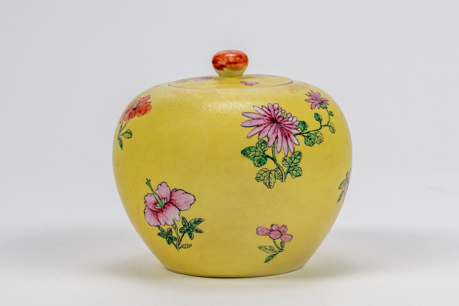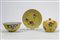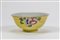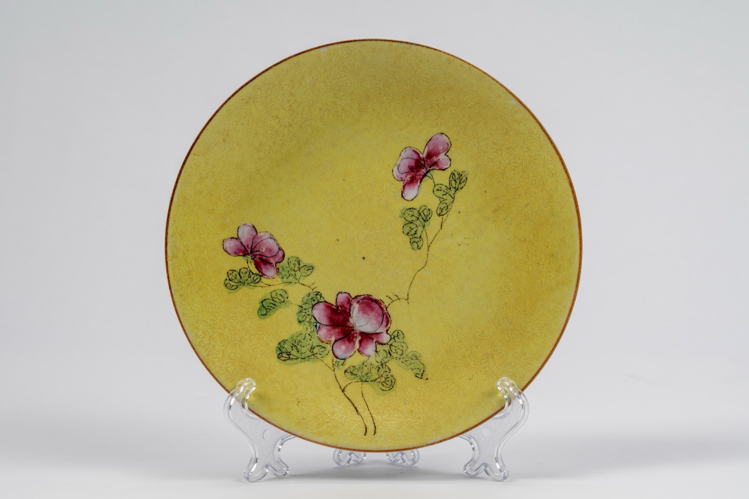 Gruppo di tre porcellane composto da piatto, ciotola e potiche a sfondo giallo limone e inciso con motivo a viticcio anhua, decoro a smalti famiglia rosa, Cina dinastia Qing