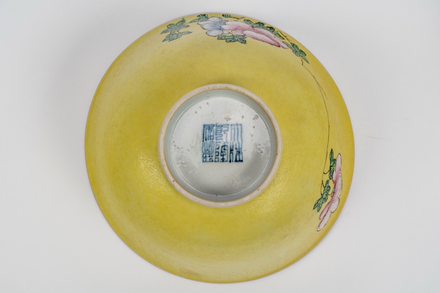三件瓷器一组,包括盘、碗和罐,柠檬黄色底,暗刻缠枝纹,粉彩装饰,中国,清代tutti con decorazioni in smalti famille rose policromi raffiguranti fiori stagionali con fogliame verde indicante Buona Fortuna e Prosperità e basi con marca Qianlong a sigillo in blu di cobalto a sei caratteri in stile zhuanshu.
