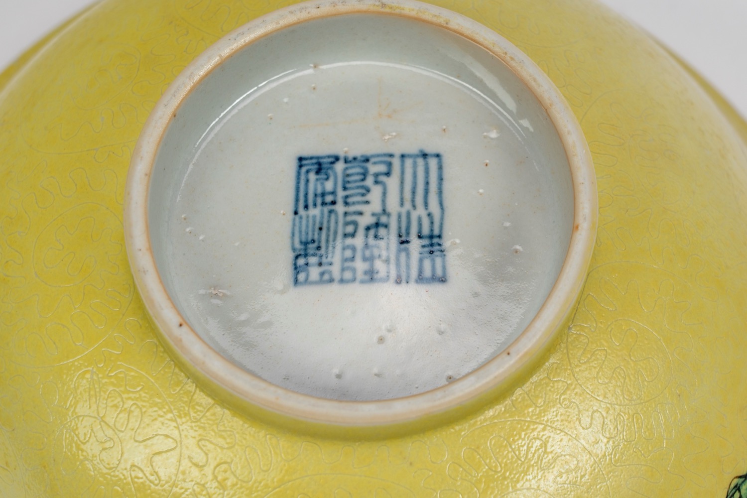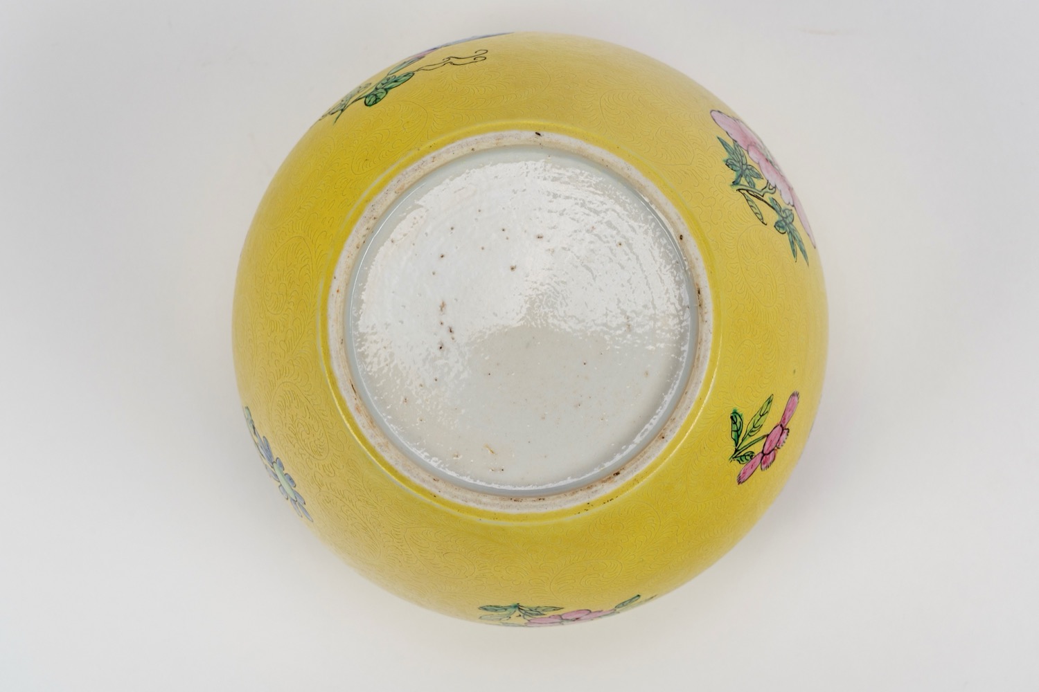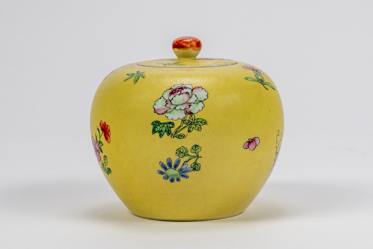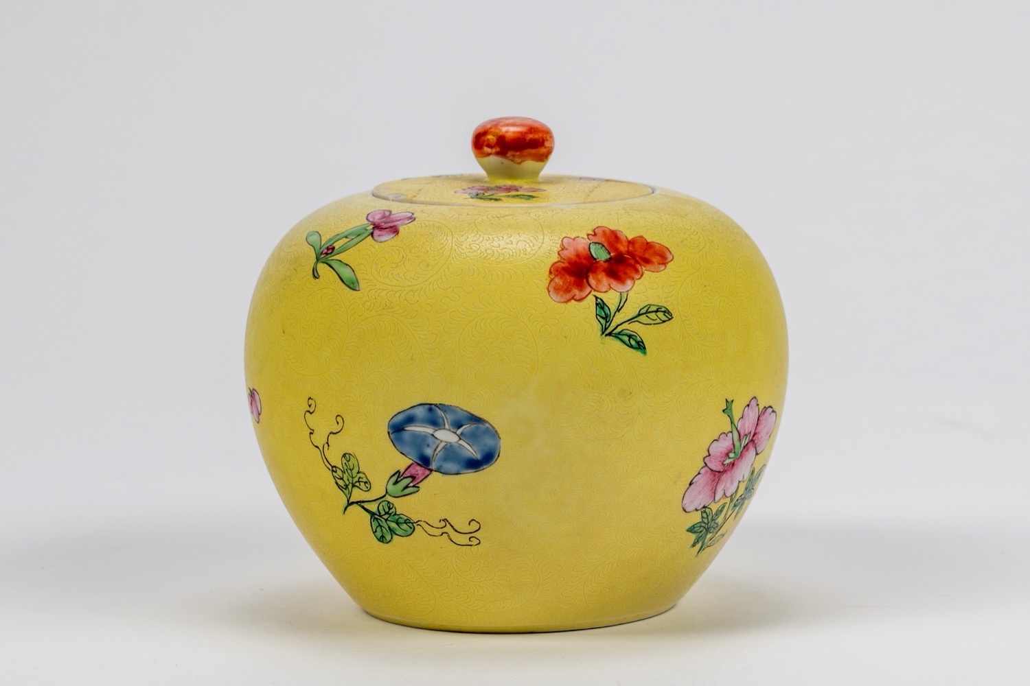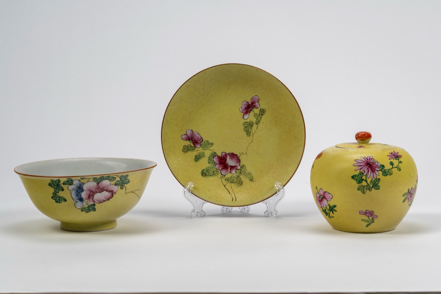 三件瓷器一组,包括盘、碗和罐,柠檬黄色底,暗刻缠枝纹,粉彩装饰,中国,清代