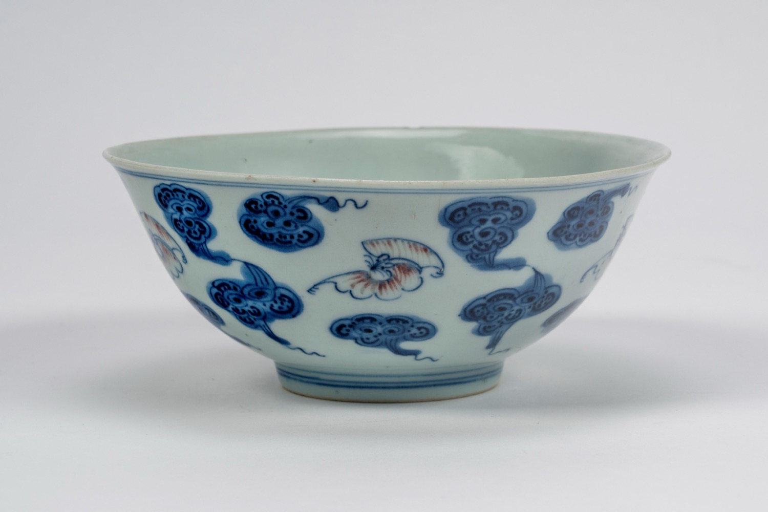 白瓷碗,青花和釉下红装饰,饰灵芝和蝴蝶纹,中国,清代