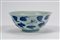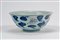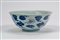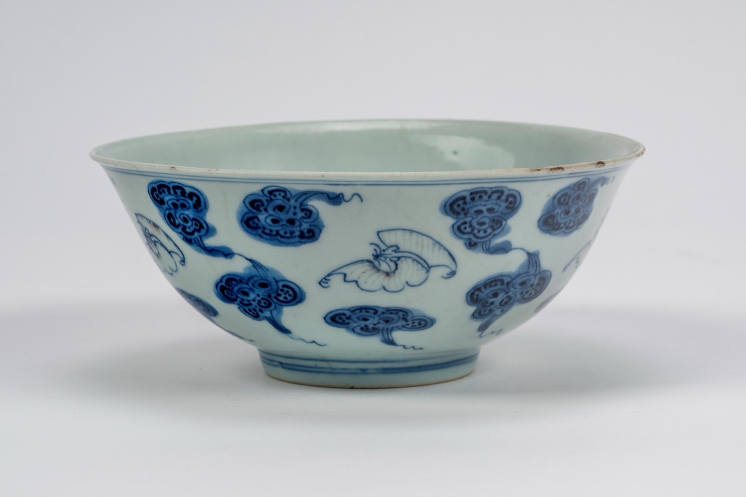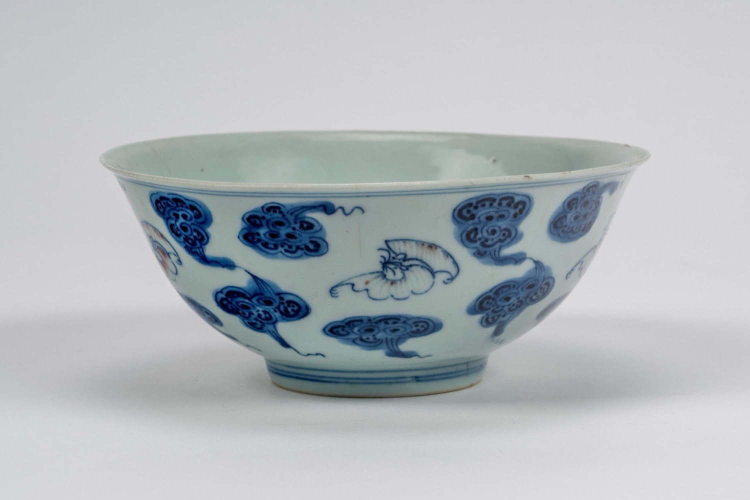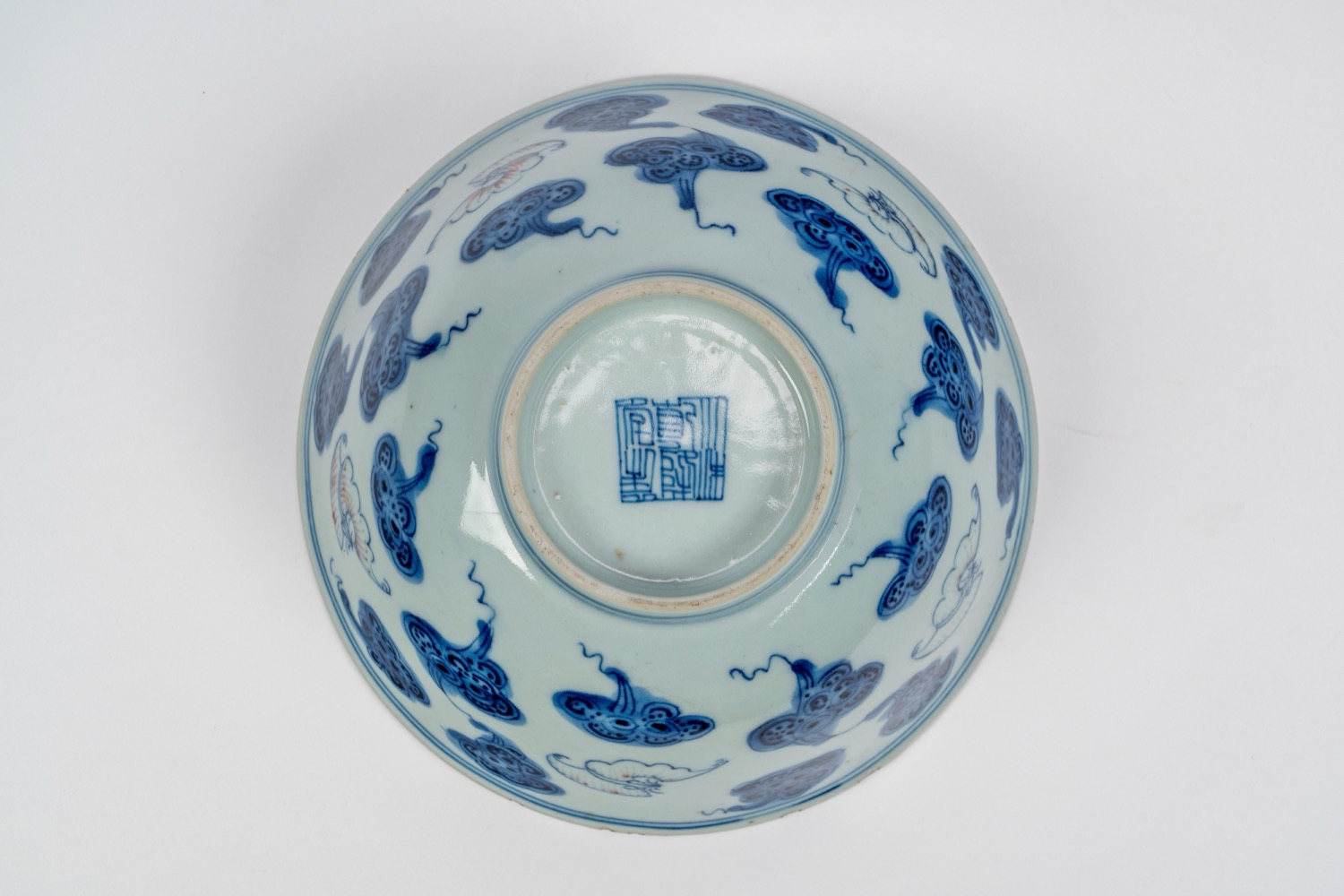 Ciotola in porcellana bianca con blu e rosso sottovetrina con lingzhi e farfalle, Cina, dinastia Qing
