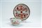 Tazzina con piattino in porcellana con decoro rosso ferro e oro a vasi con rami di foglie e fiori. Cina, secolo XVIII