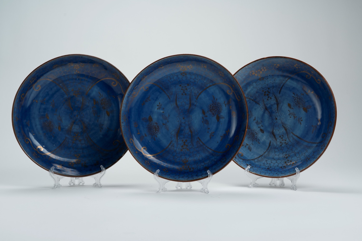 Tre piatti in porcellana con invetriatura powder blue e decori dorati. Cina, secolo XVIII/XIX