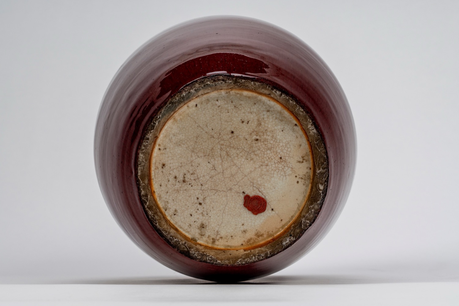 瓷瓶,卵形,单色红釉,中国,清代,道光时期con spalla arrotondata, apertura ristretta priva di collo e base piatta, interamente rivestito da una vetrina in tonalità rosso sangue di bue (sang de bœuf), con caratteristiche striature verticali più scure nella parte superiore e schiarimento verso il rosso-viola nella parte inferiore, orlo superiore con vetrina grigio-scura.