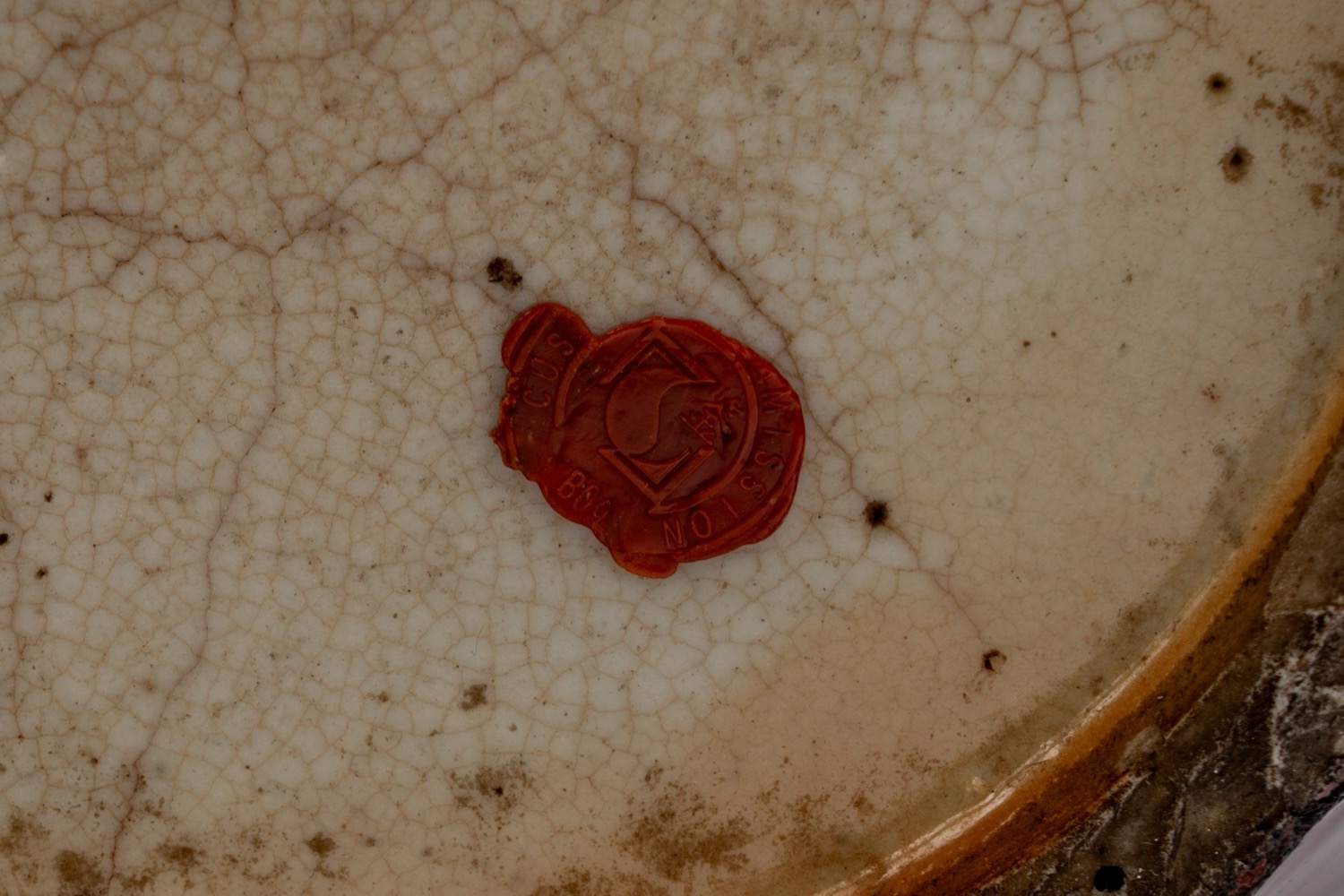 con spalla arrotondata, apertura ristretta priva di collo e base piatta, interamente rivestito da una vetrina in tonalità rosso sangue di bue (sang de bœuf), con caratteristiche striature verticali più scure nella parte superiore e schiarimento verso il rosso-viola nella parte inferiore, orlo superiore con vetrina grigio-scura.