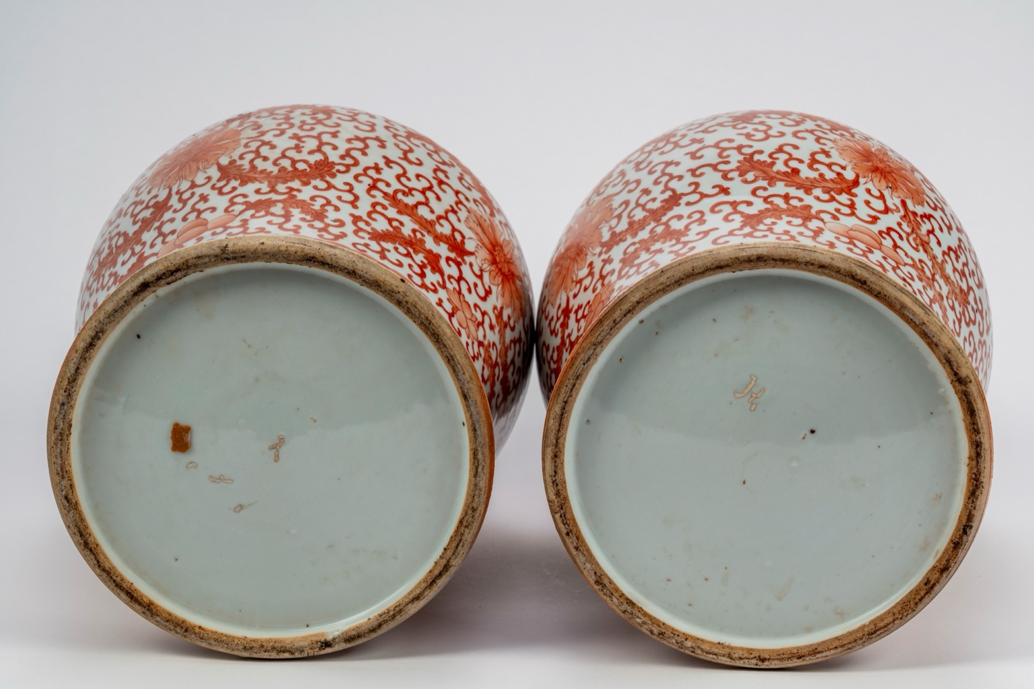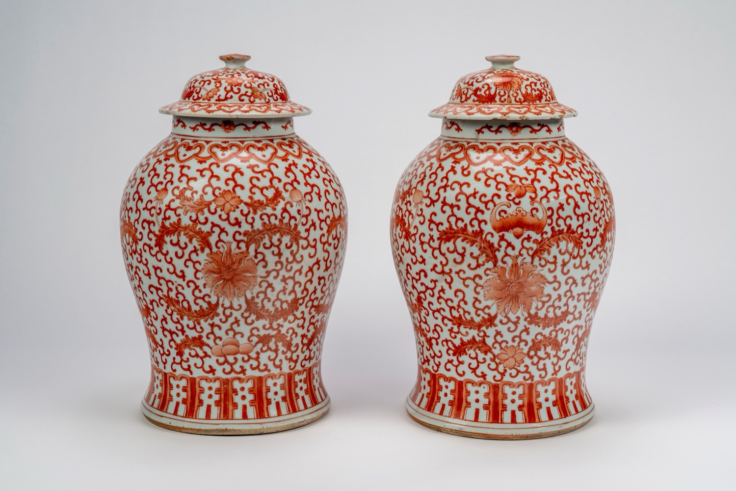 一对带盖瓷瓶,饰铁红彩,中国,清代a corpo balaustrato con collo breve, spalla sfuggente e base svasata, ciascuno corredato di coperchio a calotta con presa a bottone, la decorazione interamente eseguita in rosso di ferro (iron red) rivestita da un fitto motivo continuo di girali fogliacei e volute entro cui si inscrivono fiori di loto, crisantemi e motivi vegetali stilizzati; il coperchio riprende il medesimo repertorio decorativo.