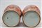 a corpo balaustrato con collo breve, spalla sfuggente e base svasata, ciascuno corredato di coperchio a calotta con presa a bottone, la decorazione interamente eseguita in rosso di ferro (iron red) rivestita da un fitto motivo continuo di girali fogliacei e volute entro cui si inscrivono fiori di loto, crisantemi e motivi vegetali stilizzati; il coperchio riprende il medesimo repertorio decorativo.