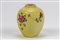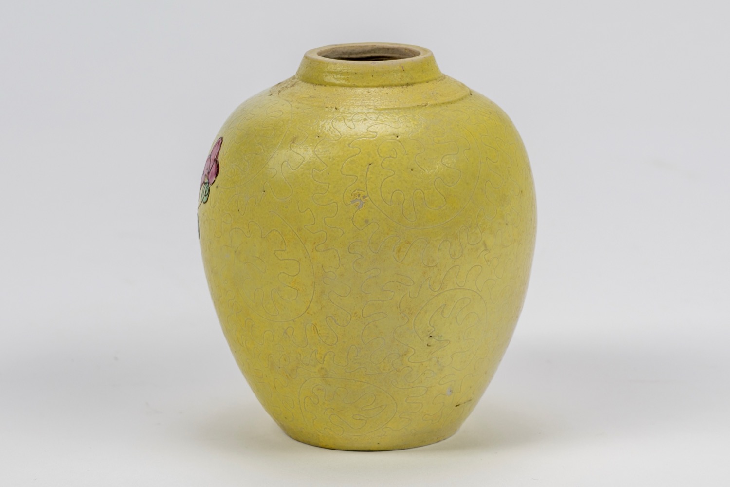 小瓷瓶,柠檬黄地,暗刻卷草纹,粉彩装饰,中国,清代raffiguranti fiori stagionali con fogliame verde.