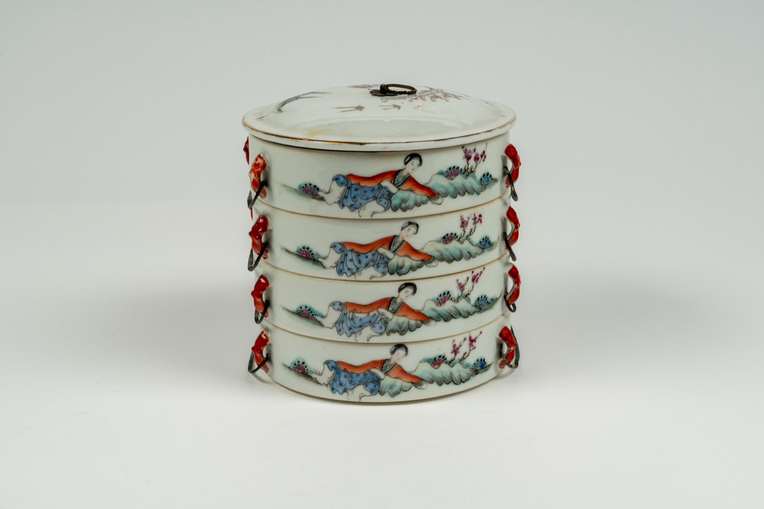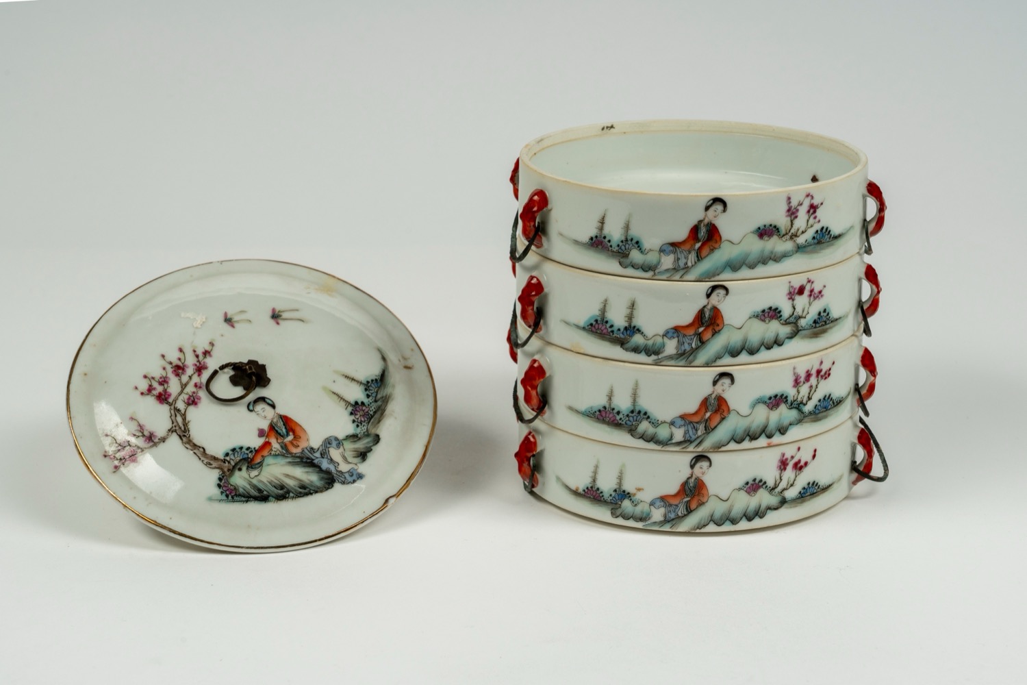 composto da quattro scomparti biansati e anellati in porcellana bianca decorata a figure orientali entro paesaggio con rami fioriti e uccelli.