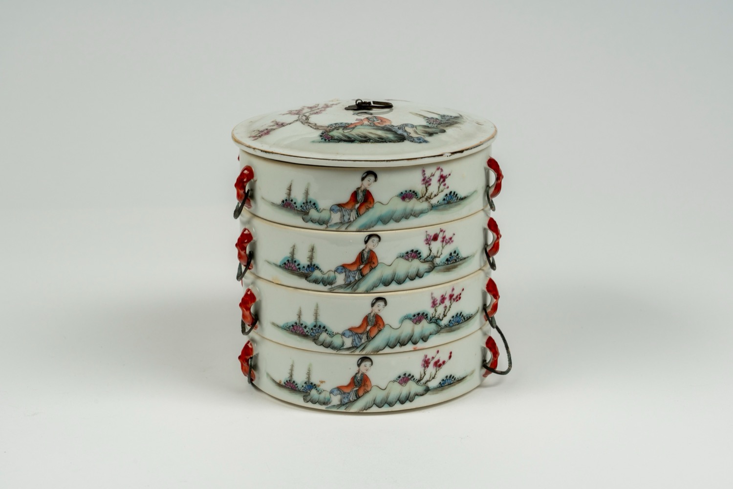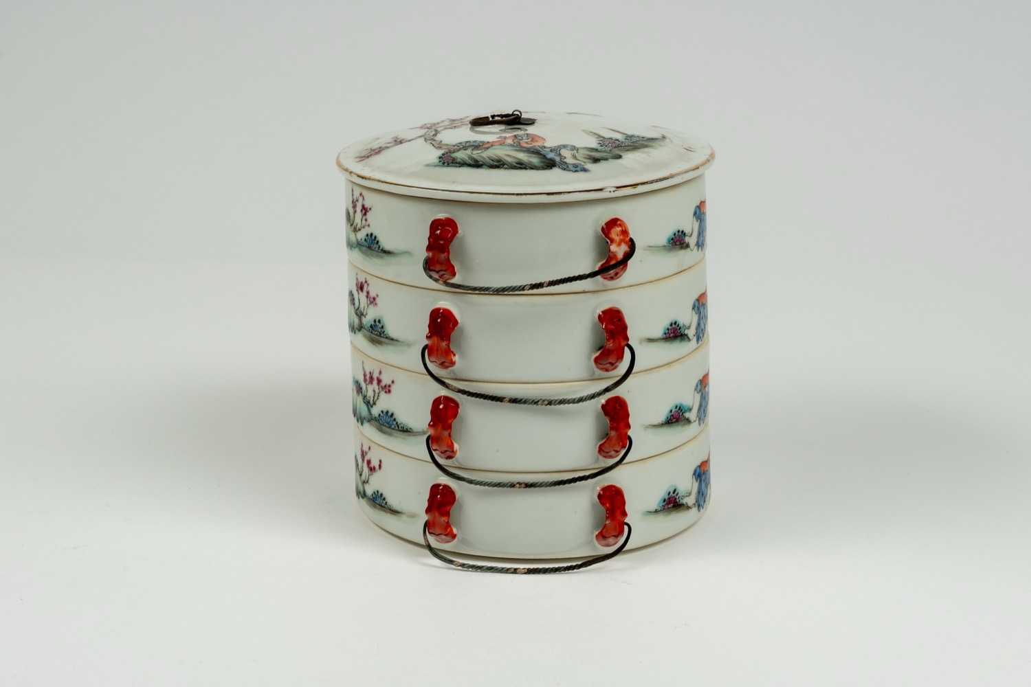 瓷食盒,中国,二十世纪composto da quattro scomparti biansati e anellati in porcellana bianca decorata a figure orientali entro paesaggio con rami fioriti e uccelli.