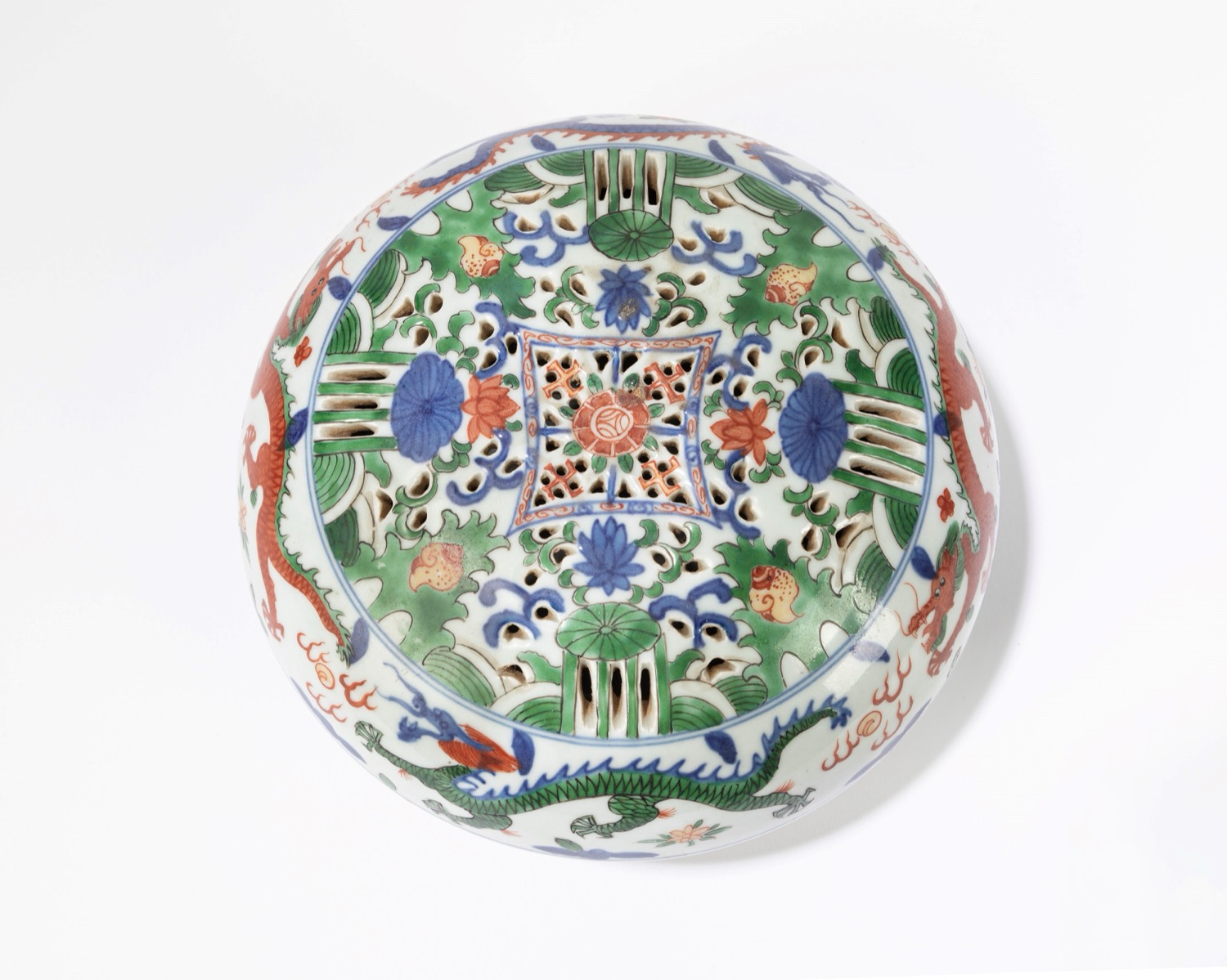 decorata con draghi a cinque artigli che inseguono la perla fiammeggiante tra nuvole e fiori; il coperchio traforato decorato con motivi fogliacei, fiori di loto e simboli buddhisti, alla base reca marchio apocrifo a sei caratteri Wanli