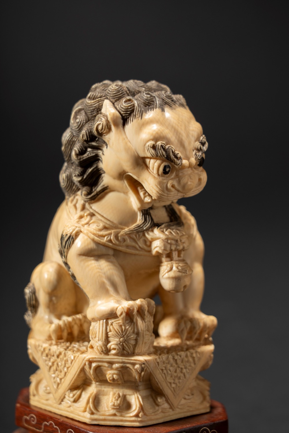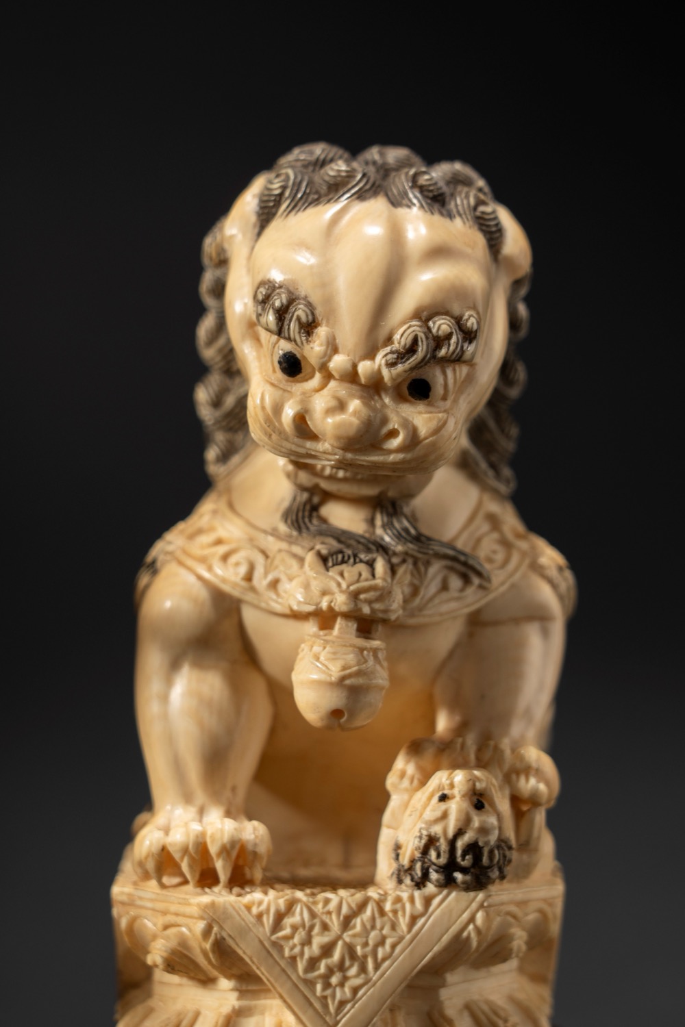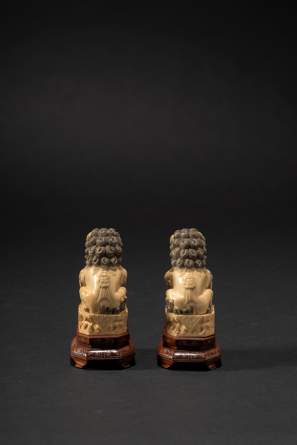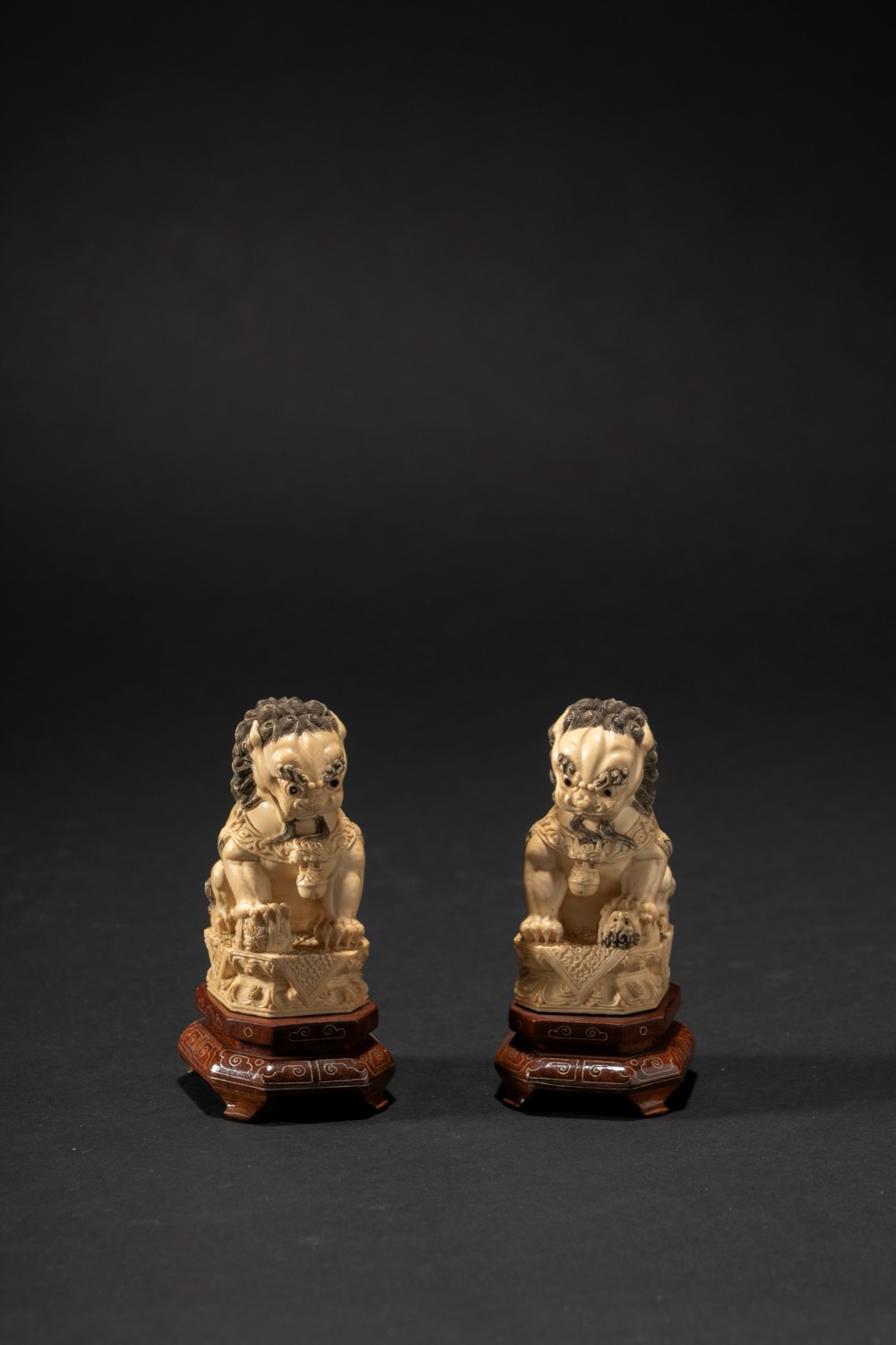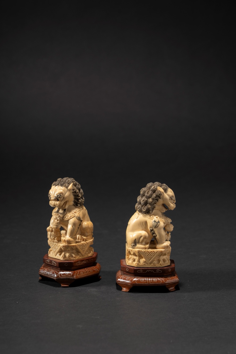 Coppia di cani di Pho in avorio tinto e intagliato, Cina, fine XIX secolo / inizi XX Secolo