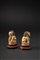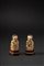 le bestie bardate e raffigurate sedute su tappeti e poggianti su plinti di loto, ciascuna con una zampa anteriore poggiata rispettivamente su un cucciolo prono e su una palla, criniera ricciuta incisa e pupille evidenziate con tinta nera. Basi di legno.