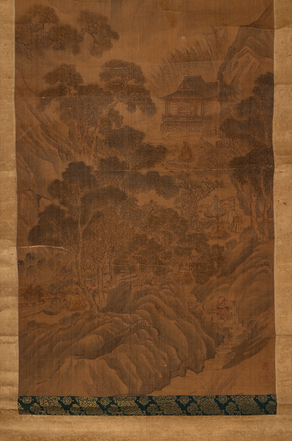 Dipinto verticale su seta raffigurante paesaggio montano con letterati e padiglioni, montato a rotolo, Cina, XVII / XVIII secolo