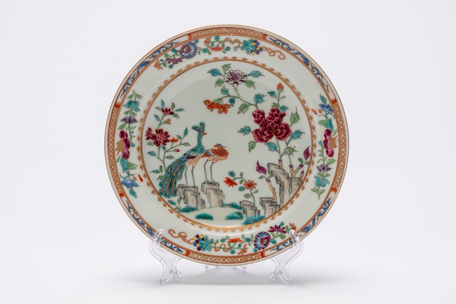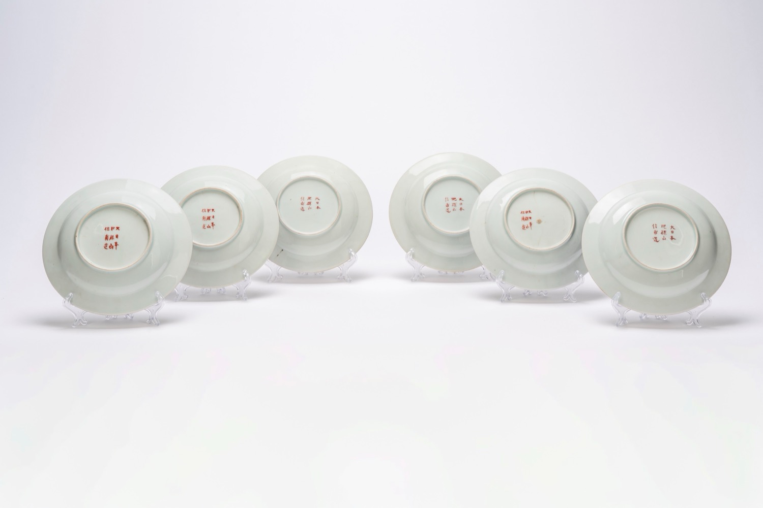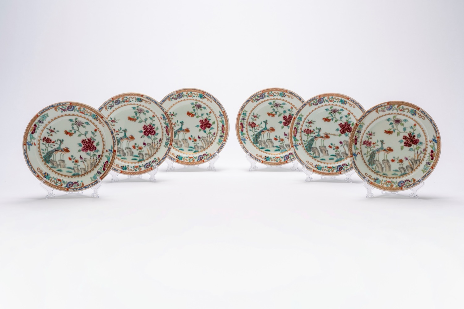 Sei rari piatti in porcellana decorata a smalti famiglia rosa in stile Qianlong da esportazione, Giappone, periodo Meiji