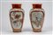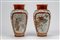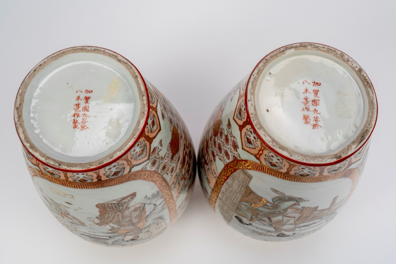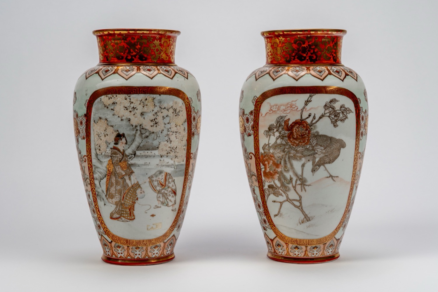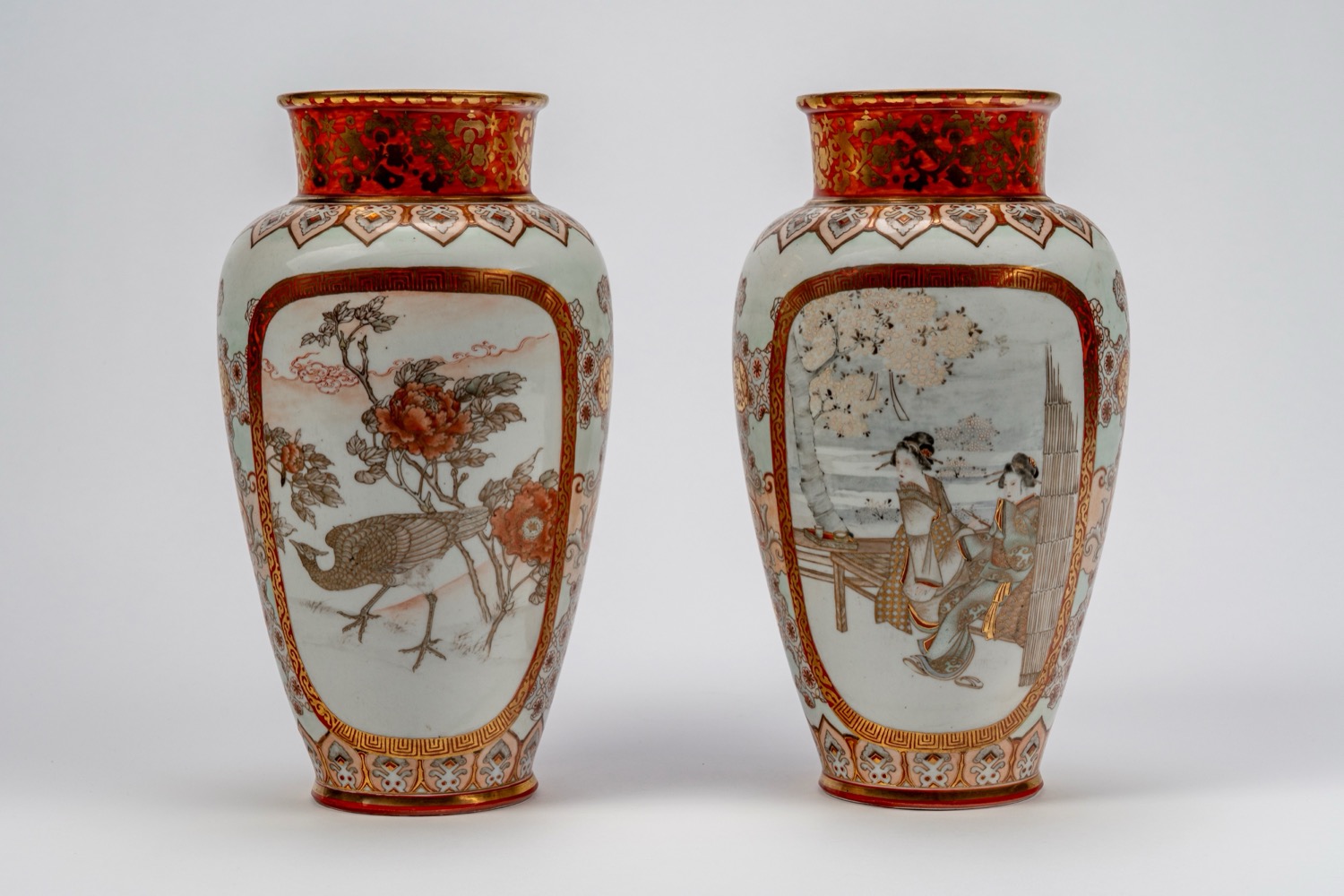 di forma ovoidale con collo svasato, decorati alterna fondi in rosso corallo con motivi floreali dorati a pannelli su fondo bianco, uno con figure femminili in kimono tra sakura in fiore, l'altro con uccello tra rami di peonia; collo, spalla e base con fregi geometrici tipici del repertorio Kaga-Kutani. firmati Yagi Jinpeidi forma ovoidale con collo svasato, decorati alterna fondi in rosso corallo con motivi floreali dorati a pannelli su fondo bianco, uno con figure femminili in kimono tra sakura in fiore, l'altro con uccello tra rami di peonia; collo, spalla e base con fregi geometrici tipici del repertorio Kaga-Kutani. firmati Yagi Jinpei
