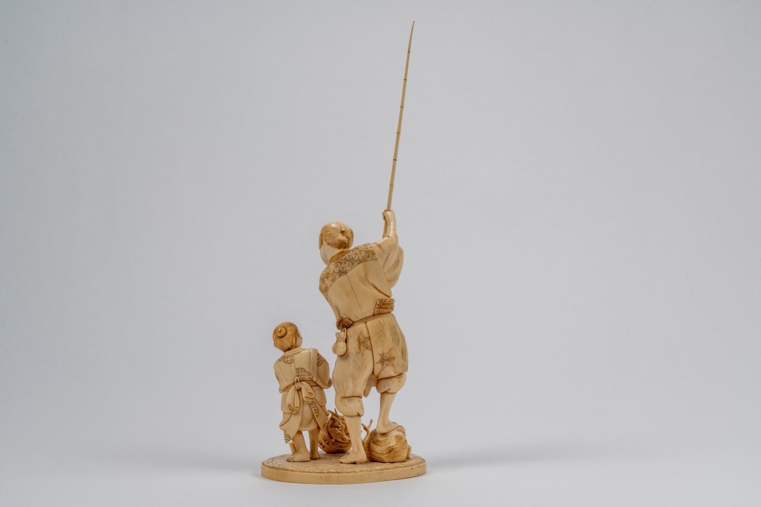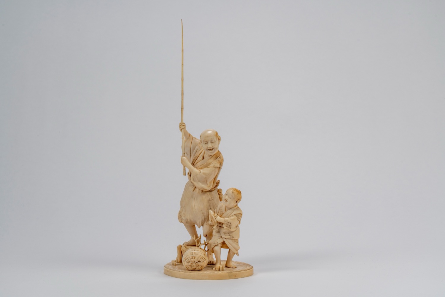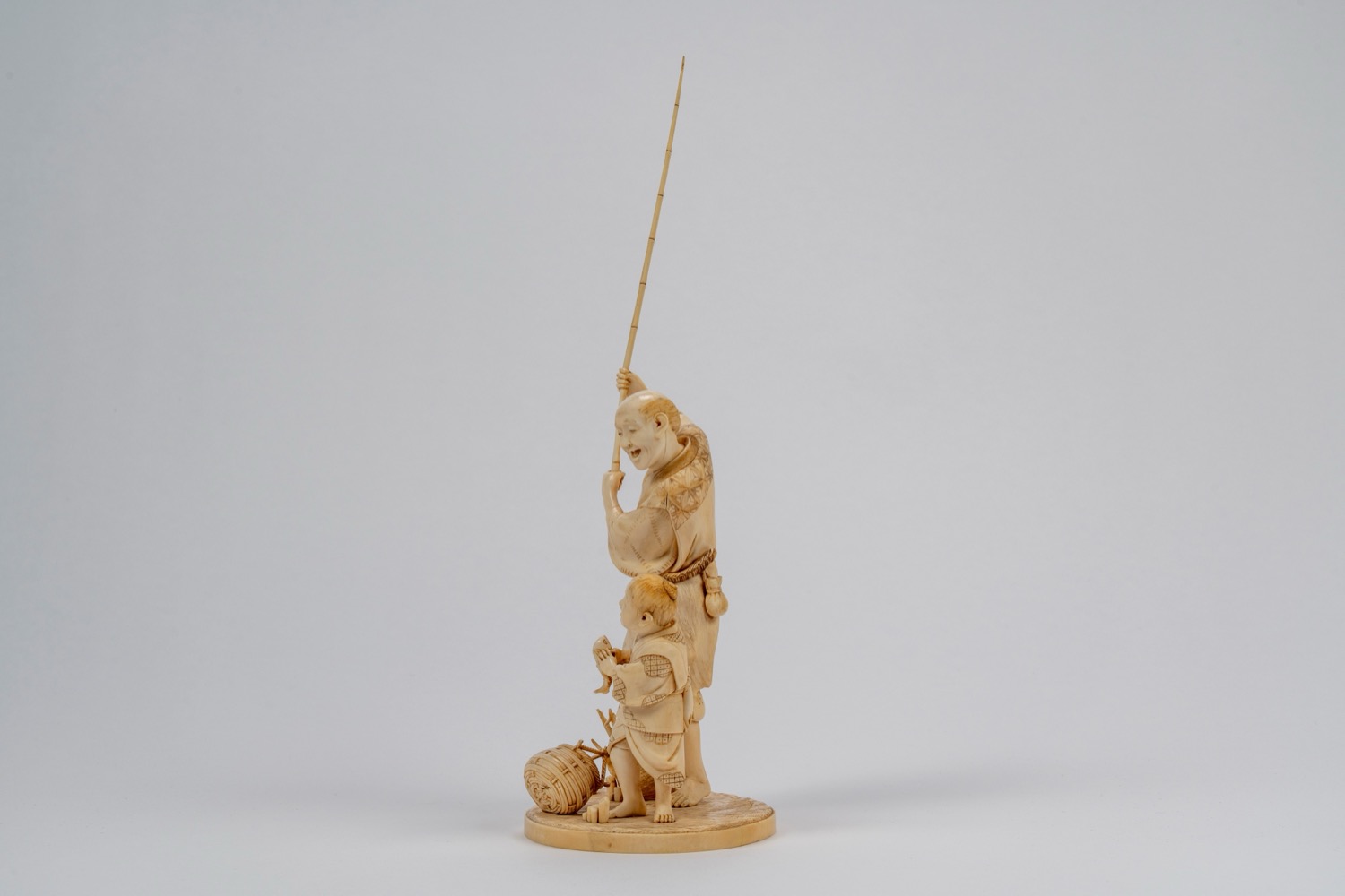 Okimono in avorio con pescatore e ragazzo, firmato Kakō, Giappone, epoca Meiji (1868–1912)