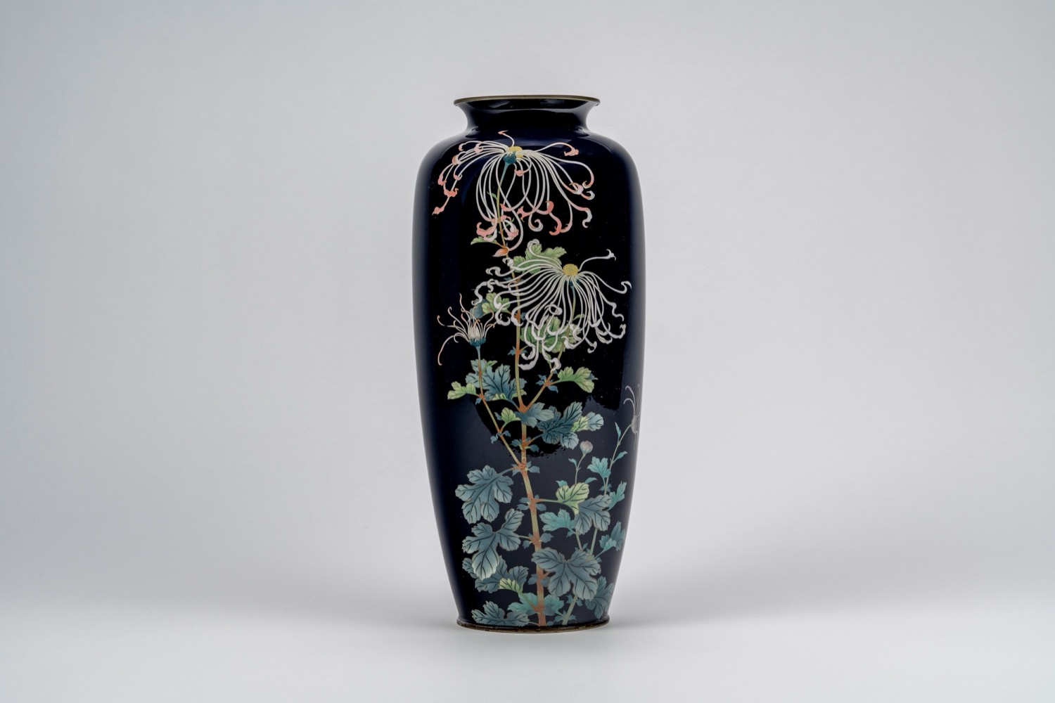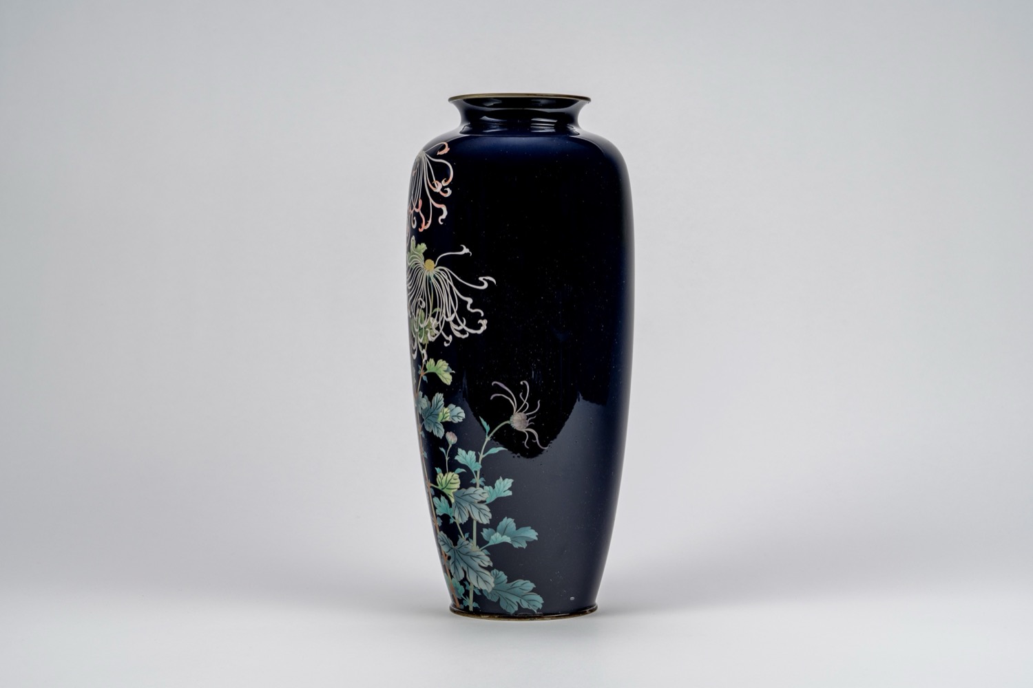 Lot 129 | Elegante vaso cloisonné decoro con fiori a sfondo blu notte, Giappone, periodo Meiji