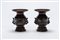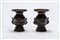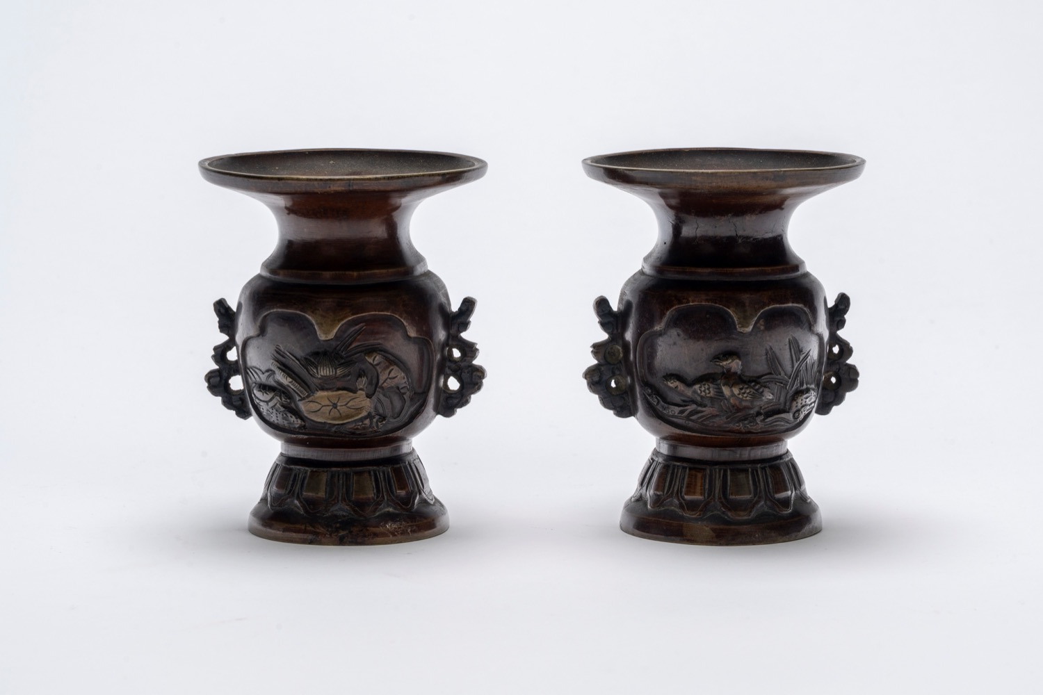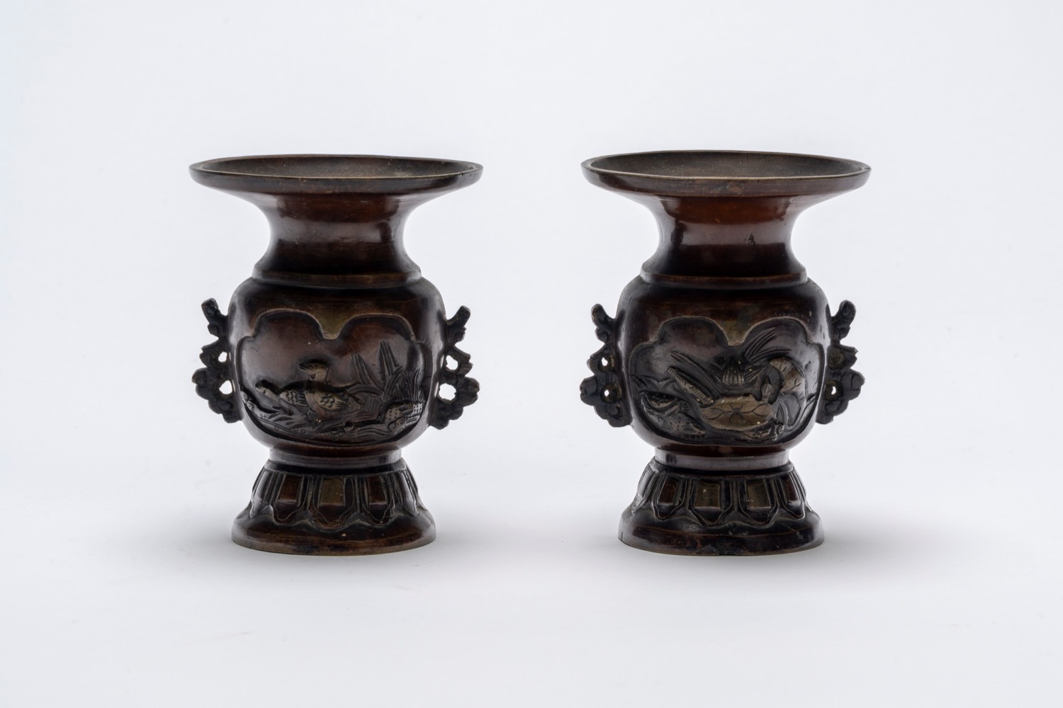 entrambi a corpo globulare schiacciato su alto piede a tamburo con base lobata a petali, bocca svasata a tromba, in bronzo brunito con bella patina bruna uniforme; ciascun esemplare decorato in rilievo sul corpo con riserva sagomata raffigurante uccelli acquatici tra fiori di loto e fogliame palustre, affiancata da due manici laterali figurati; fascia inferiore del corpo a petali di loto stilizzati raccordati al piede.entrambi a corpo globulare schiacciato su alto piede a tamburo con base lobata a petali, bocca svasata a tromba, in bronzo brunito con bella patina bruna uniforme; ciascun esemplare decorato in rilievo sul corpo con riserva sagomata raffigurante uccelli acquatici tra fiori di loto e fogliame palustre, affiancata da due manici laterali figurati; fascia inferiore del corpo a petali di loto stilizzati raccordati al piede.