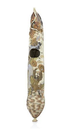 GRANDE VASO PENSILE IN CERAMICA, SATSUMA, GIAPPONE, XIX SECOLO, a forma di baccello, decoro a figure e tralci di foglie a rilievo; rincollature e sbeccature.