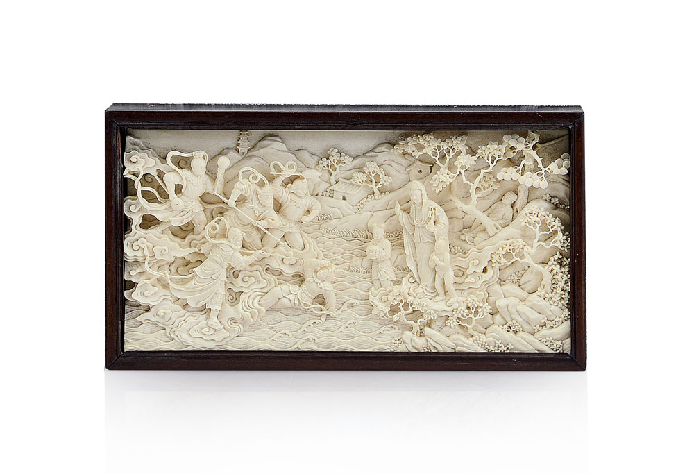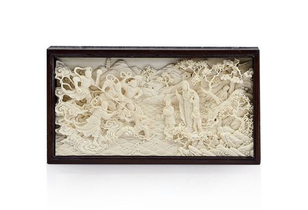 PLACCA IN AVORIO, CINA, FINE XIX SECOLO, scolpita a bassorilievo con guerrieri e divinità entro paesaggio, entro cornice in legno.