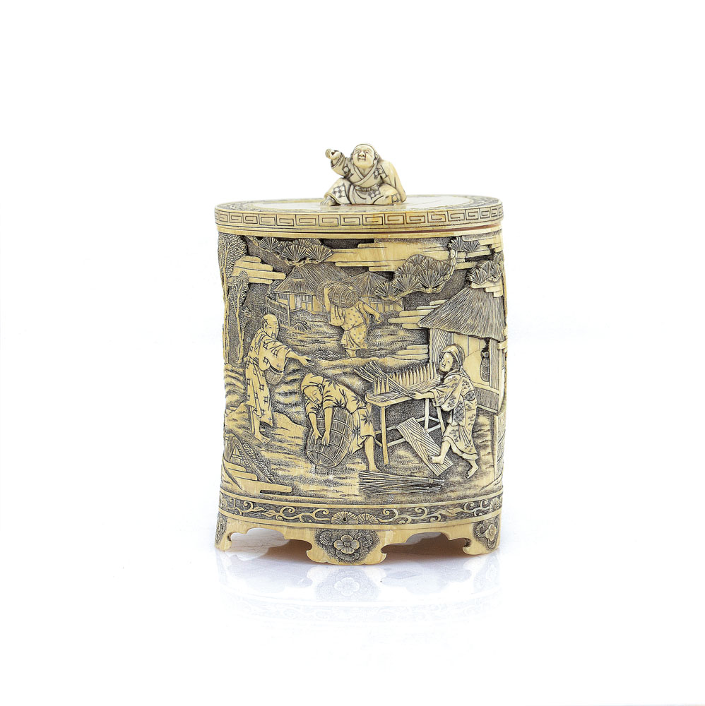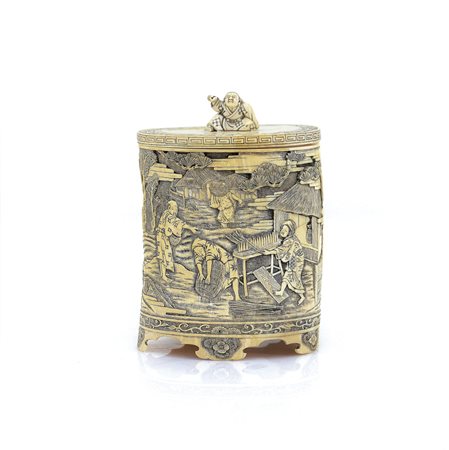 AVORIO SCATOLA CON COPERCHIO IN AVORIO, GIAPPONE, XIX SECOLO, cilindrica con...