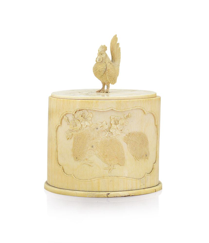 SCATOLA CON COPERCHIO IN AVORIO, GIAPPONE, XIX SECOLO, cilindrica con decori a rilievo con volatili e cimatura a gallo; rincollatura alla presa del coperchio.
