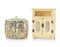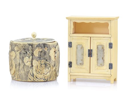 SCATOLA CON COPERCHIO IN AVORIO, GIAPPONE, XIX SECOLO, cilindrica con decori a rilievo con animali, unita a MODELLINO DI MOBILETTO CON APPLICAZIONI IN GIADA, CINA, XX SECOLO, a due antine; difetti.