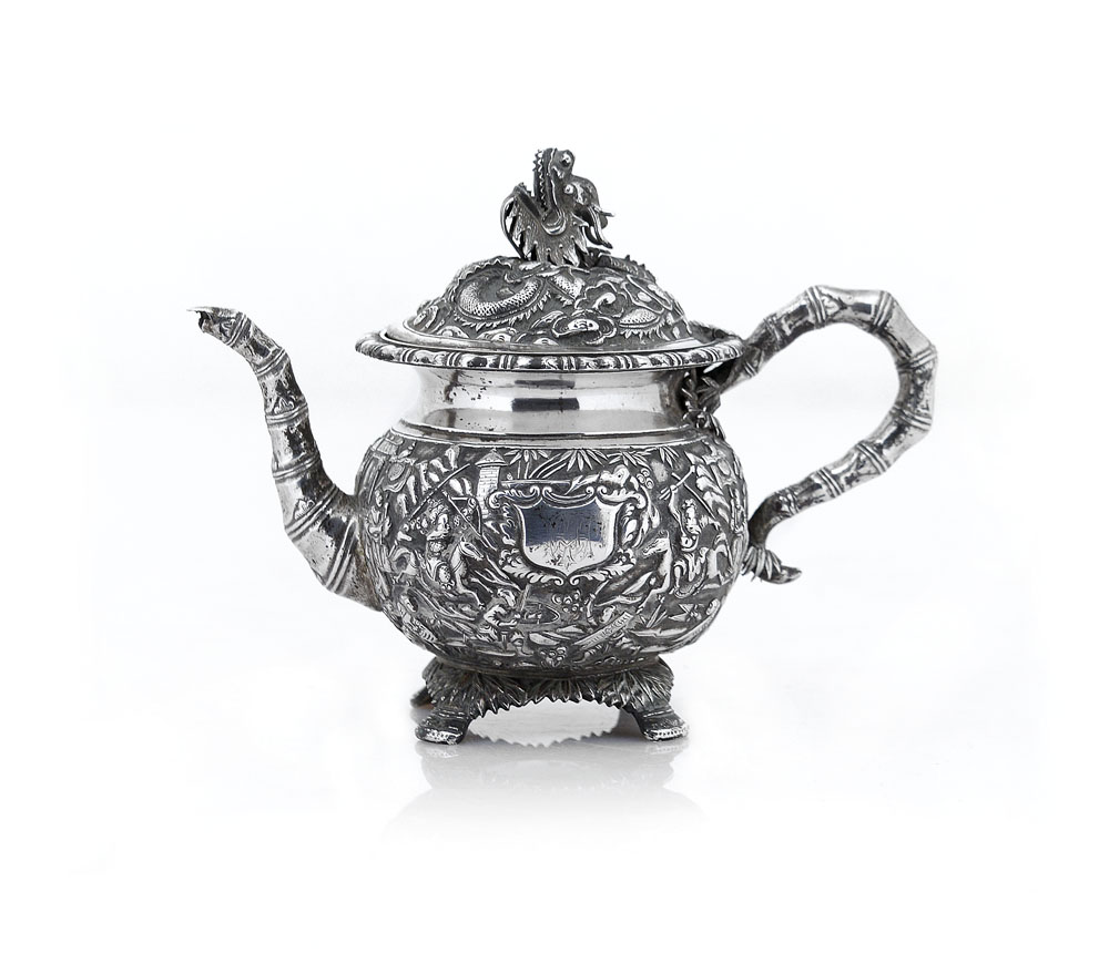 TEIERA IN ARGENTO, CINA, SHANGHAI, XIX SECOLO, globulare su piedini con decoro sbalzato a scene di vita e cavalieri.
