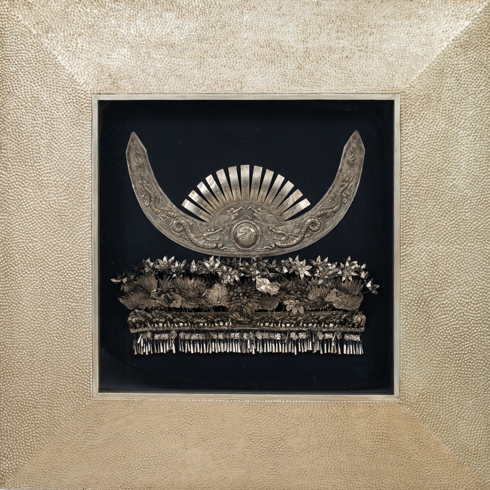 Copricapo della cultura Miao in metallo argentato, entro cornice.