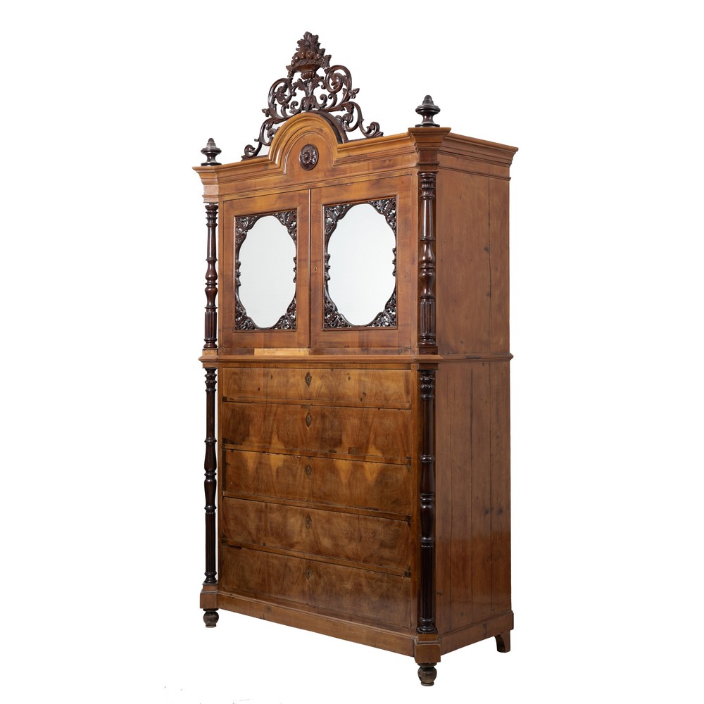 Chiffonier Luigi Filippo a cinque cassetti, due ante con specchi e colonne laterali in legno di mogano e piuma di mogano.