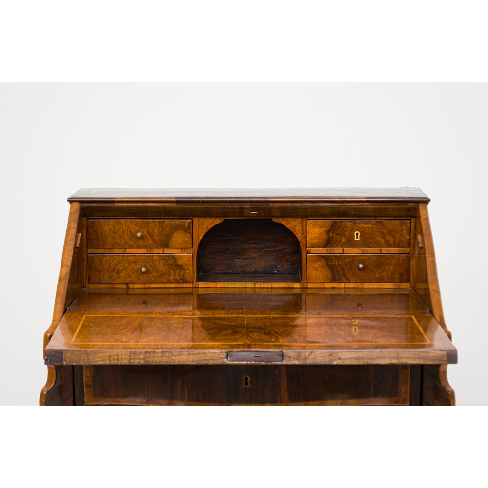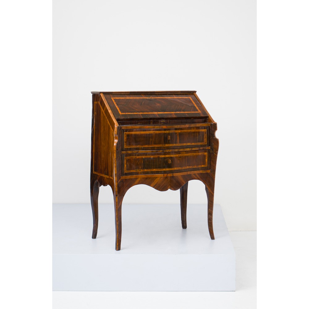 Ribalta Luigi XV in ebano violetto ed intarsi in vari legni da frutto, con due cassetti, piano a ribalta con cassettiera all'interno.
