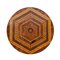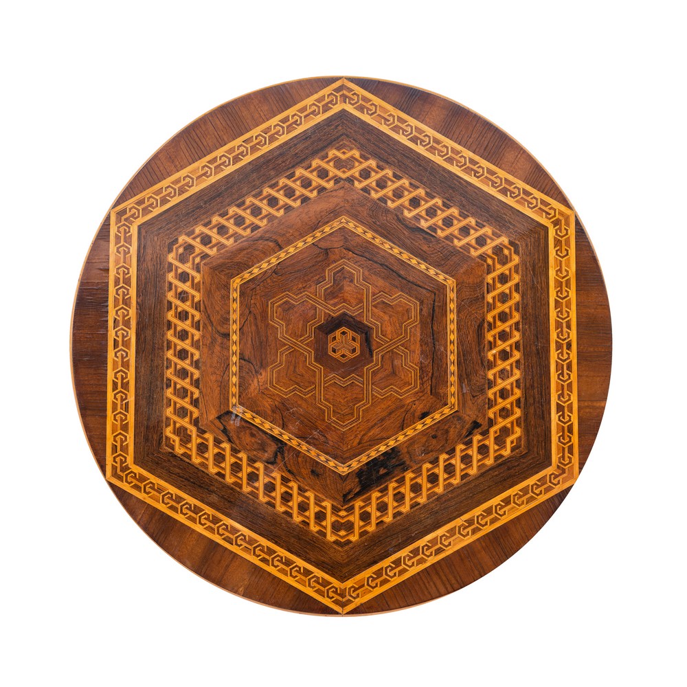 Tavolo da centro in legno di noce ed esotico, intarsiato a disegno geometrico in legno di bosso.