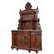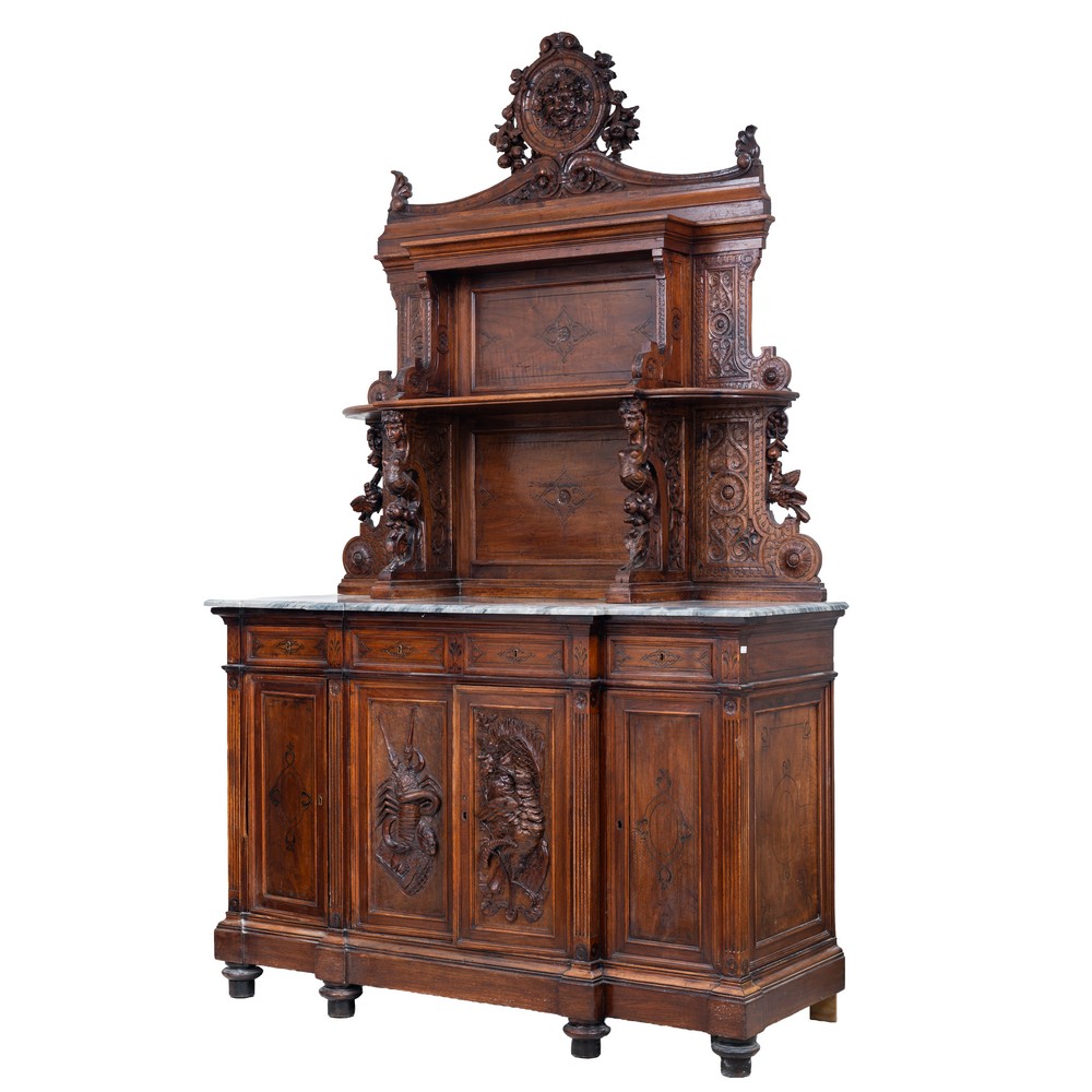 Piattaia con alzata in legno di noce a quattro ante e quattro cassetti, pannelli riccamente intagliati a motivo naturalistico, piano in marmo grigio (piano in marmo da incollare).