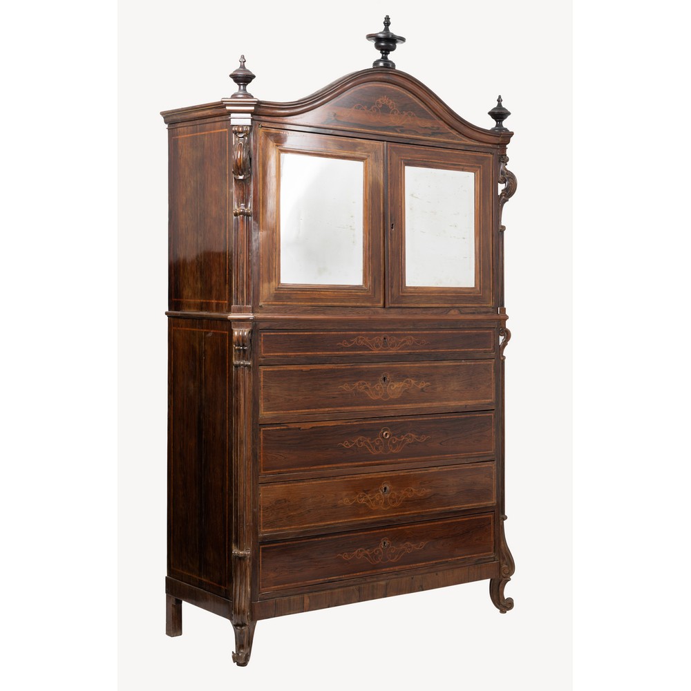 Chiffonier Luigi Filippo in legno esotico, con due ante nella parte sovrastante e cinque cassetti nella parte sottostante, filettature in bois de rose.