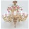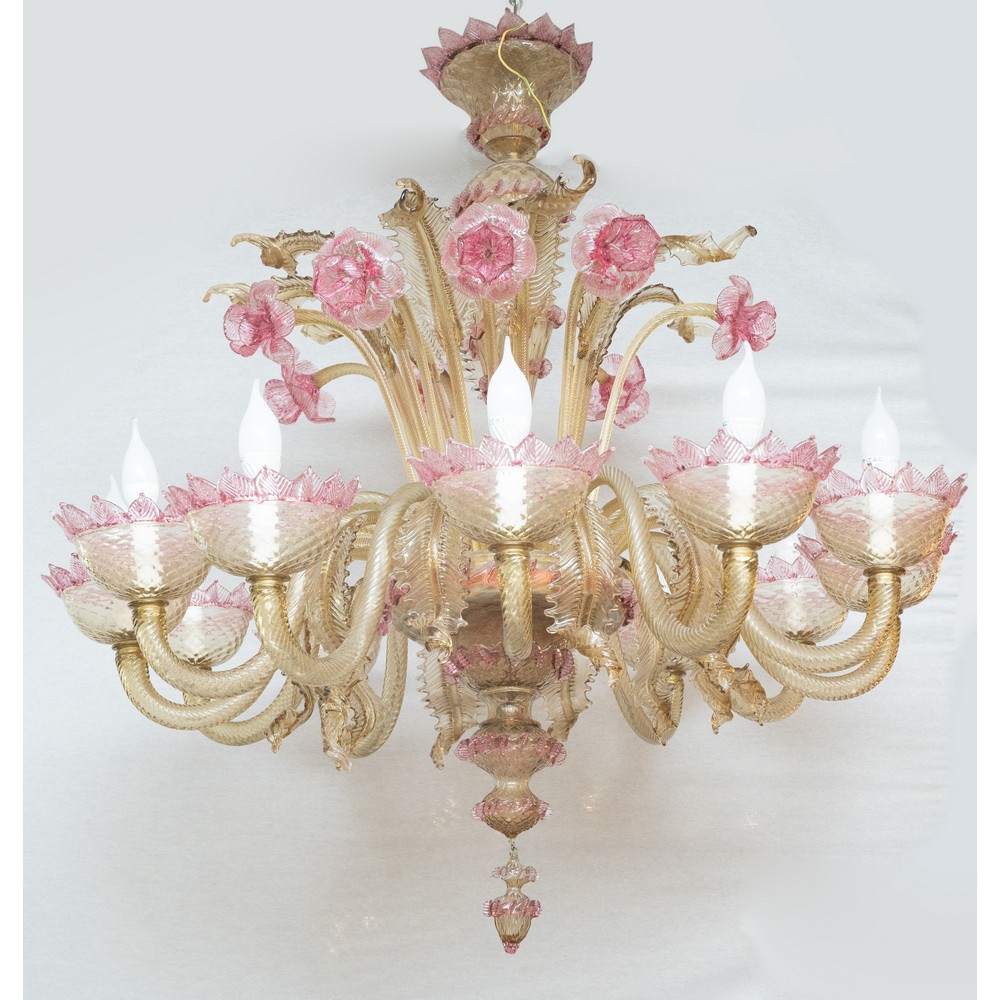 Lampadario in vetro nei toni dell'ambra e del rosa a dodici luci.