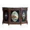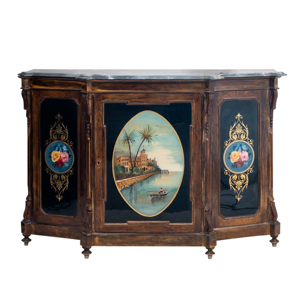 Credenza Luigi Filippo a tre ante di forma scantinata in legno esotico, ante dipinte su vetro a motivo floreale e paesaggistico, piano in marmo grigio venato.