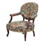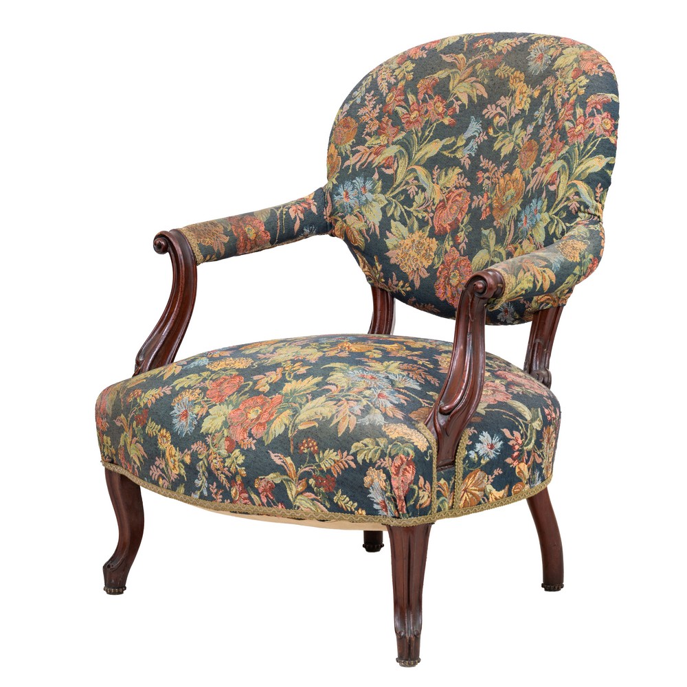 Piccola poltrona Luigi Filippo in legno di mogano, seduta e spalliera in tessuto a motivo floreale.