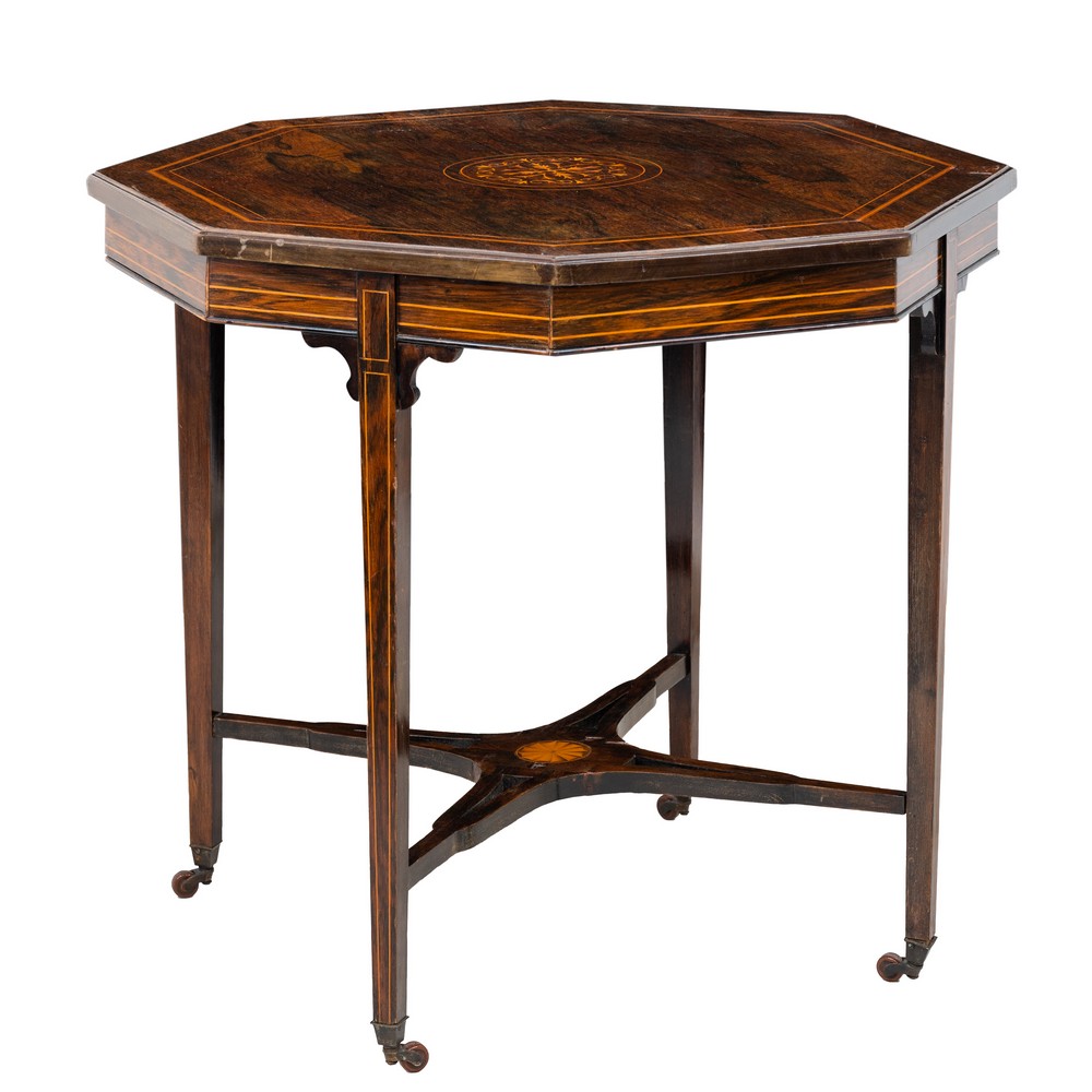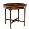 Tavolino di forma ottagonale in legno esotico, tarsie in bosso, periodo vittoriano.