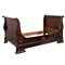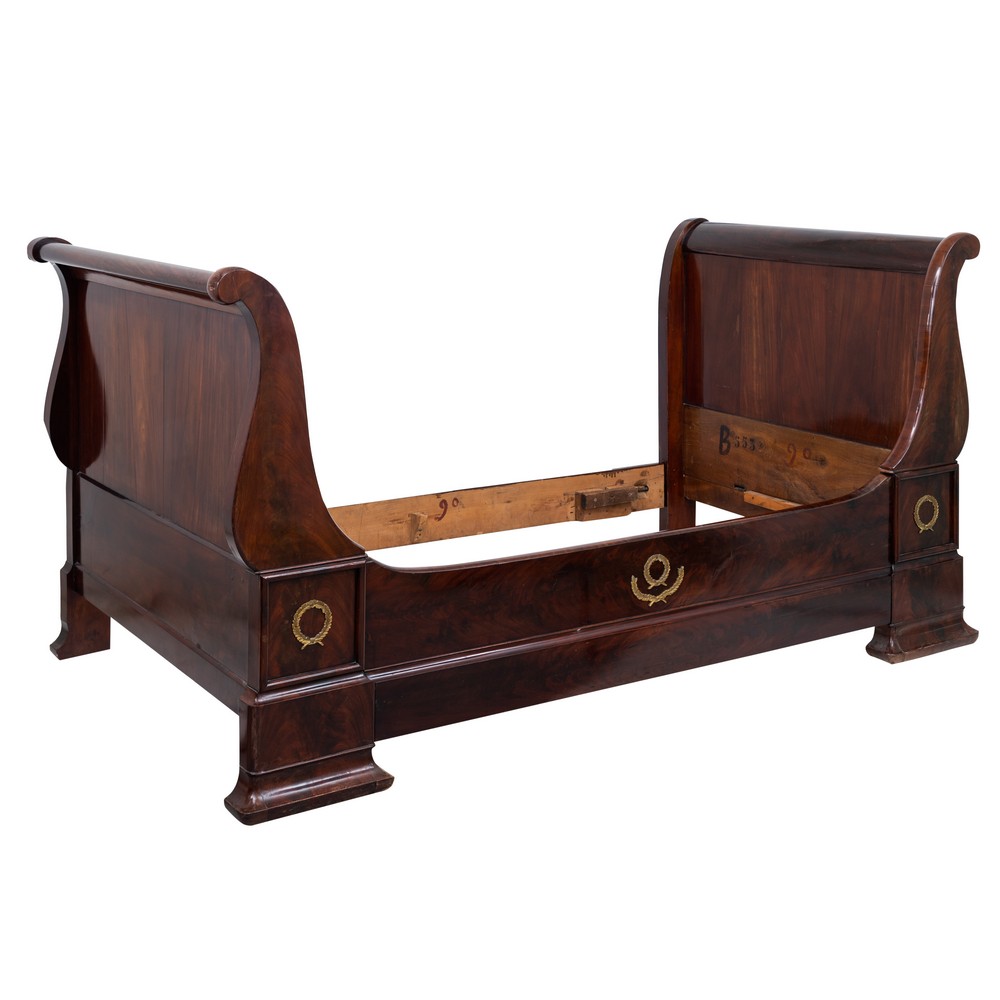 Letto a barca ad una piazza in legno di mogano e piuma di mogano, fregi in bronzo dorato.