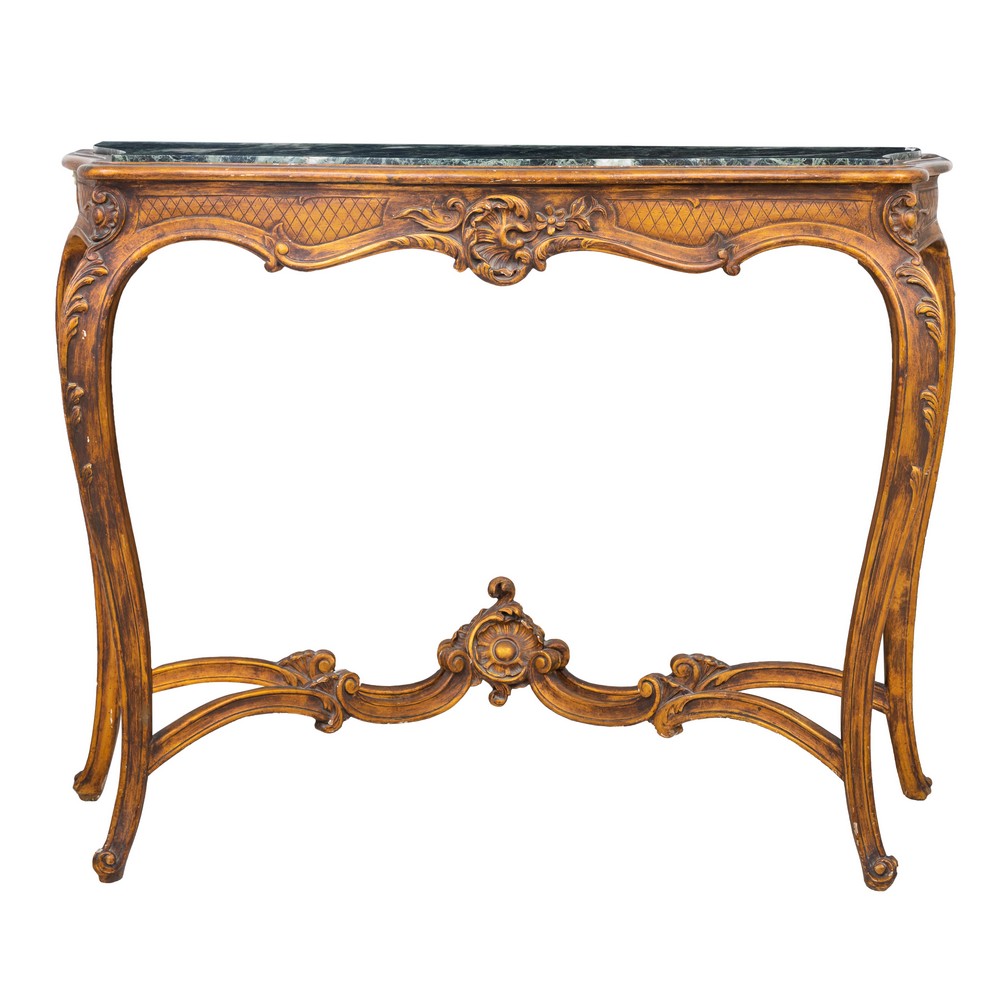 Console in legno dorato ed intagliato, piano in marmo verde delle Alpi.