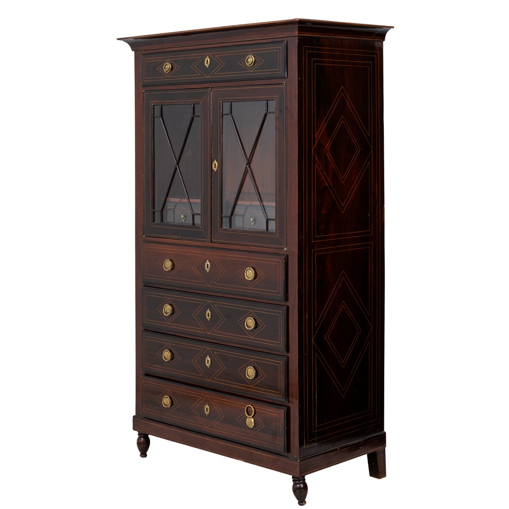 Vetrina di gusto Impero ad un'anta in legno di mogano, perfili a disegno geometrico in legno di bosso.