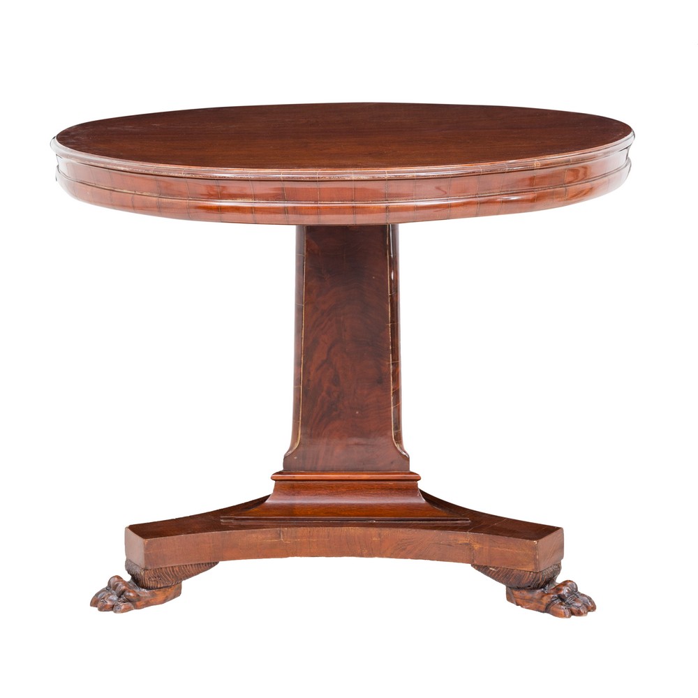 Tavolo da appoggio Impero in legno di noce, fusto centrale e tre piedi.