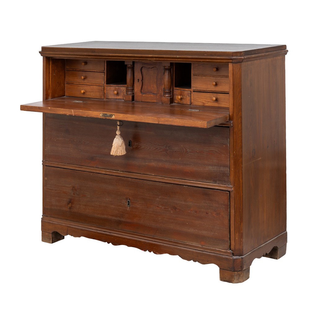 Cassettone con ribalta in legno di faggio, con due cassetti e cassettiera all'interno.