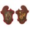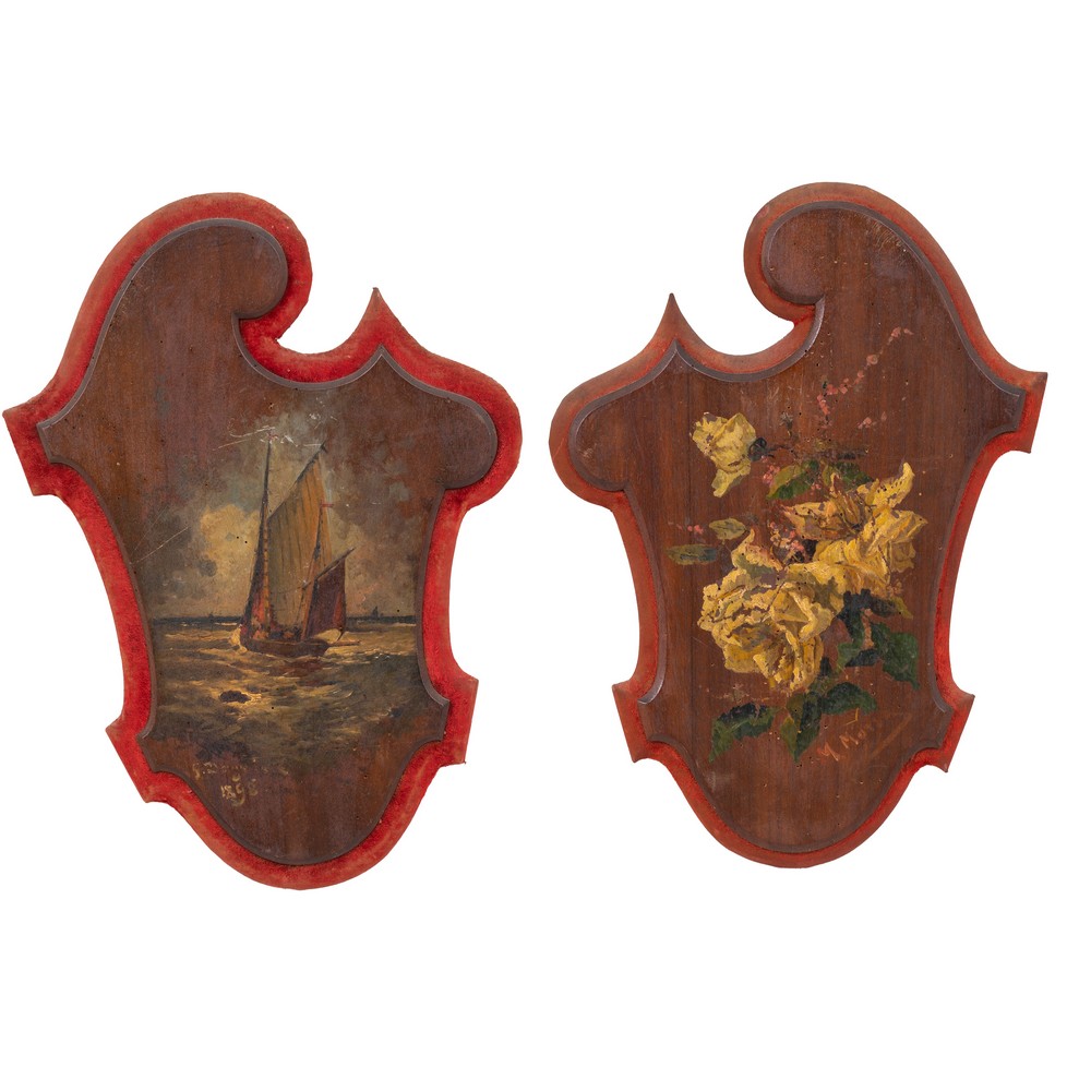 Coppia di pannelli a modo di scudo in legno dipinto a motivo floreale.