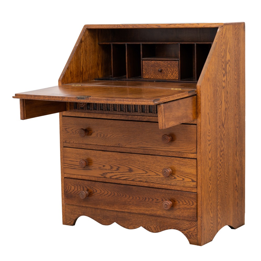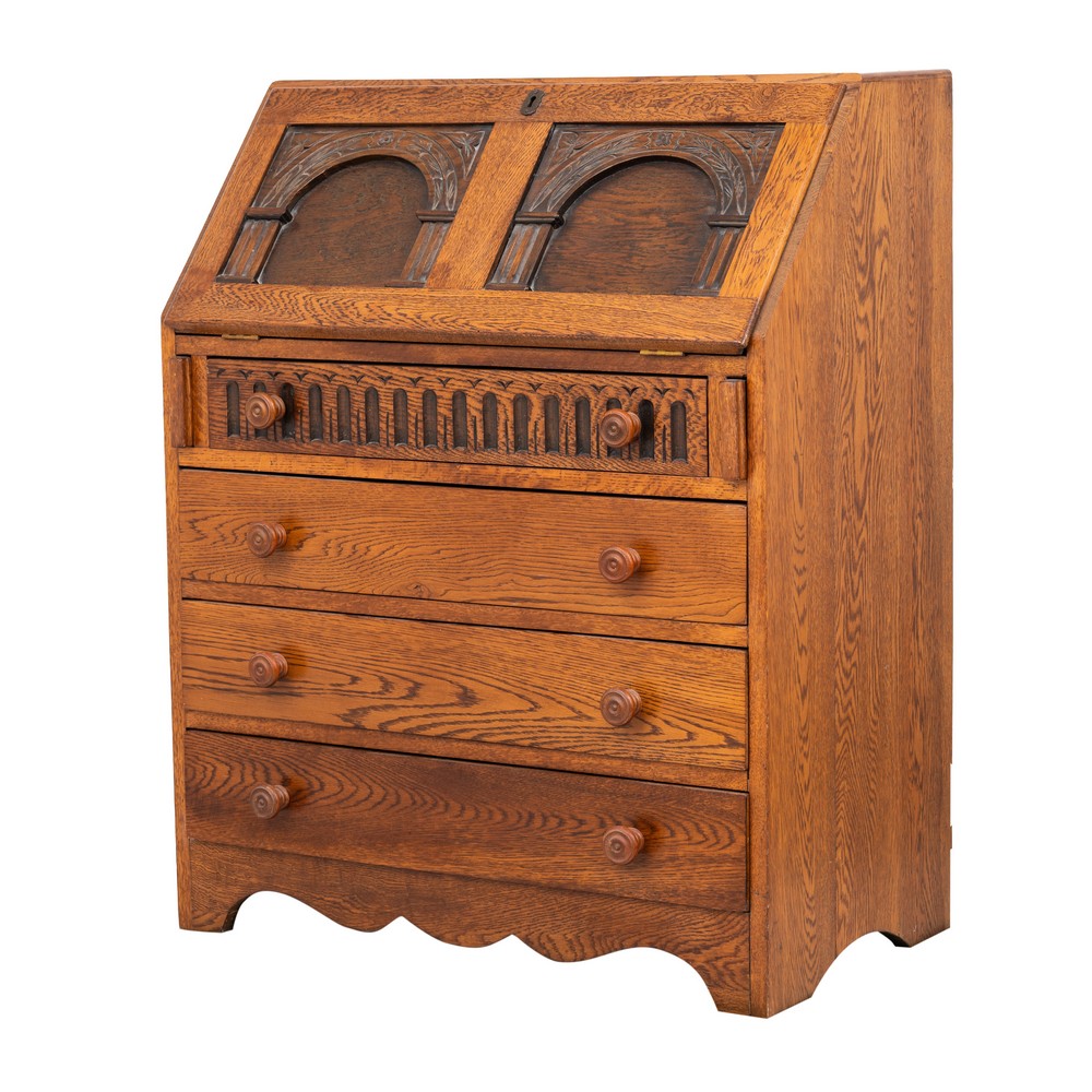 Piccola ribalta a quattro cassetti in legno di rovere.