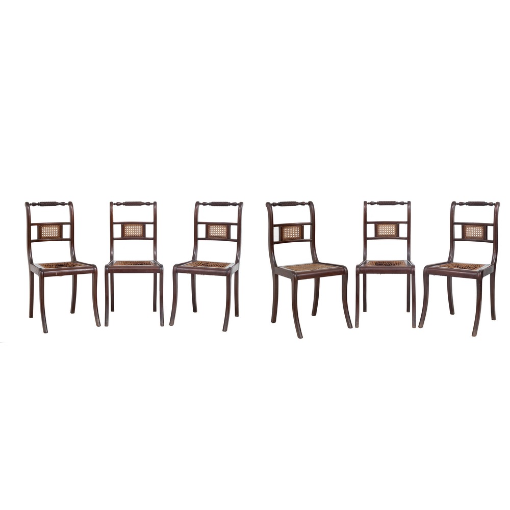 Sei sedie stile Impero in legno di mogano con sedute in paglia di Vienna (da restaurare).